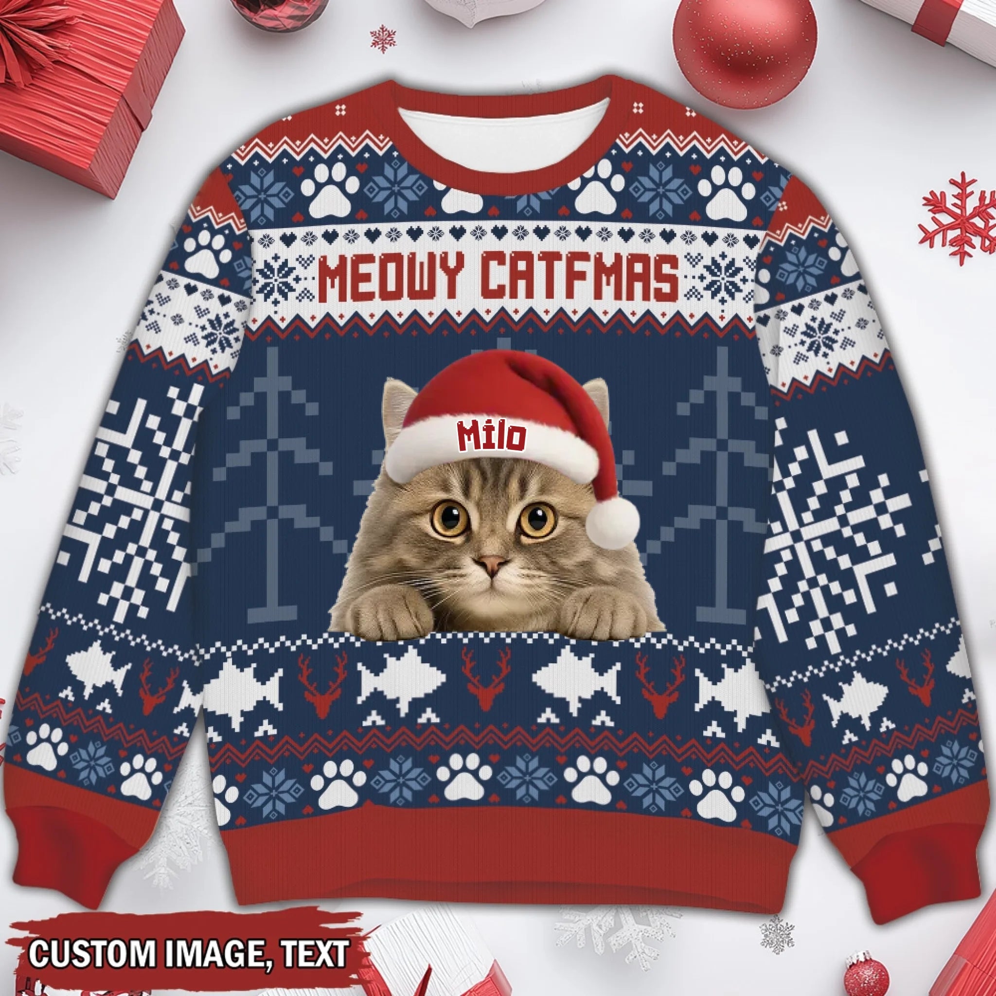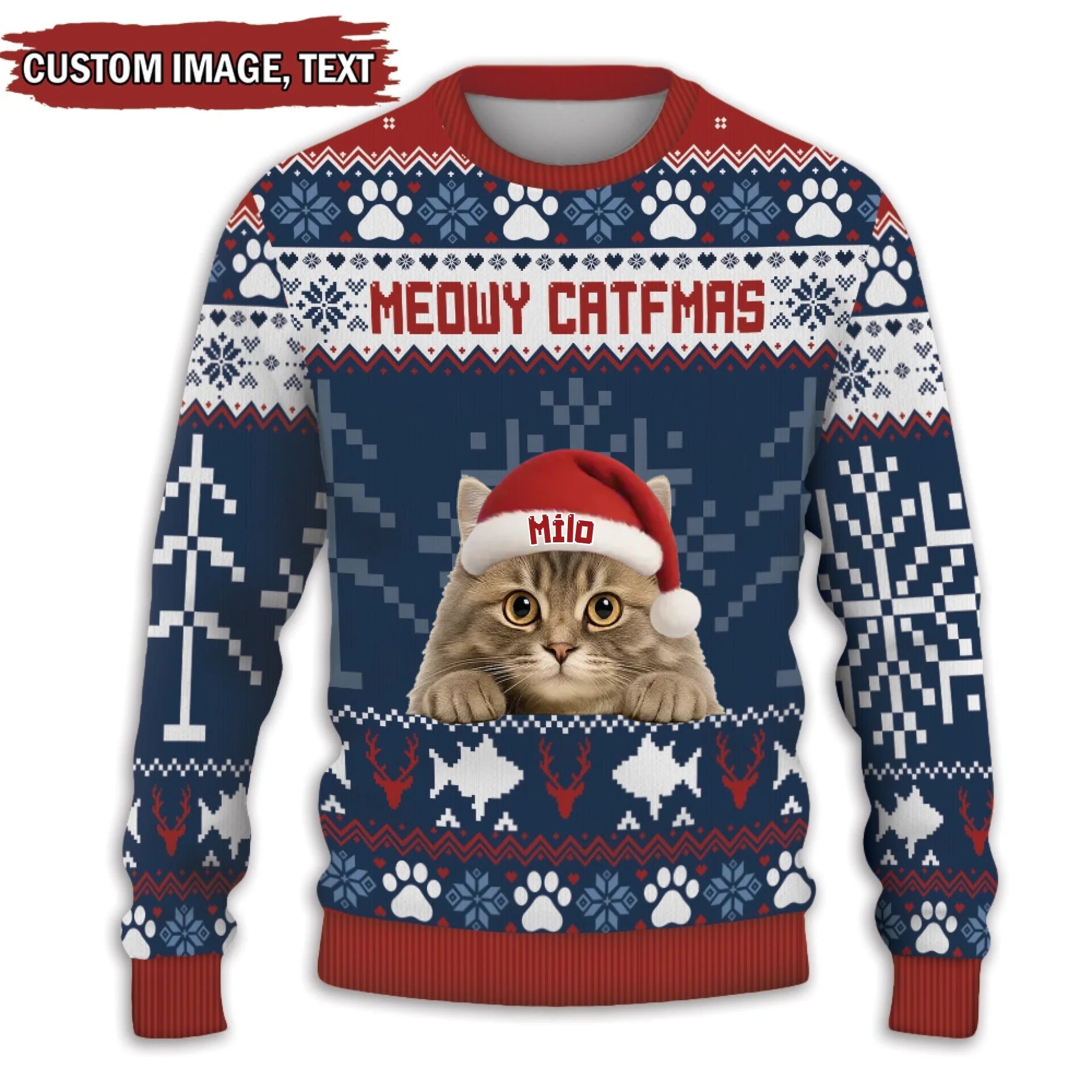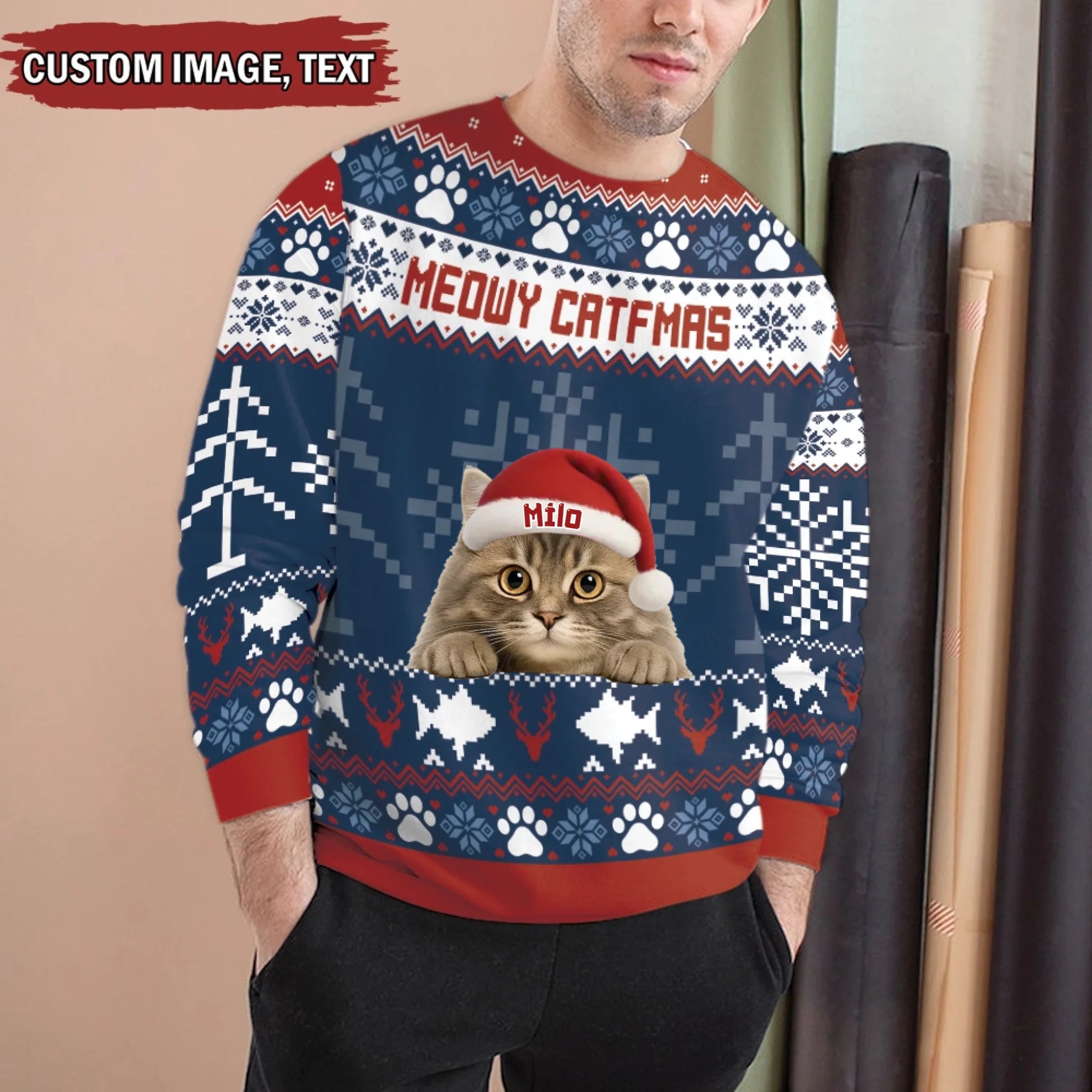 Custom Pet Cat Face Family Ugly Sweaters – Personalized Name & Photo “Meowy Catmas” Holiday Sweater | Funny Christmas Gift for Cat Lovers
