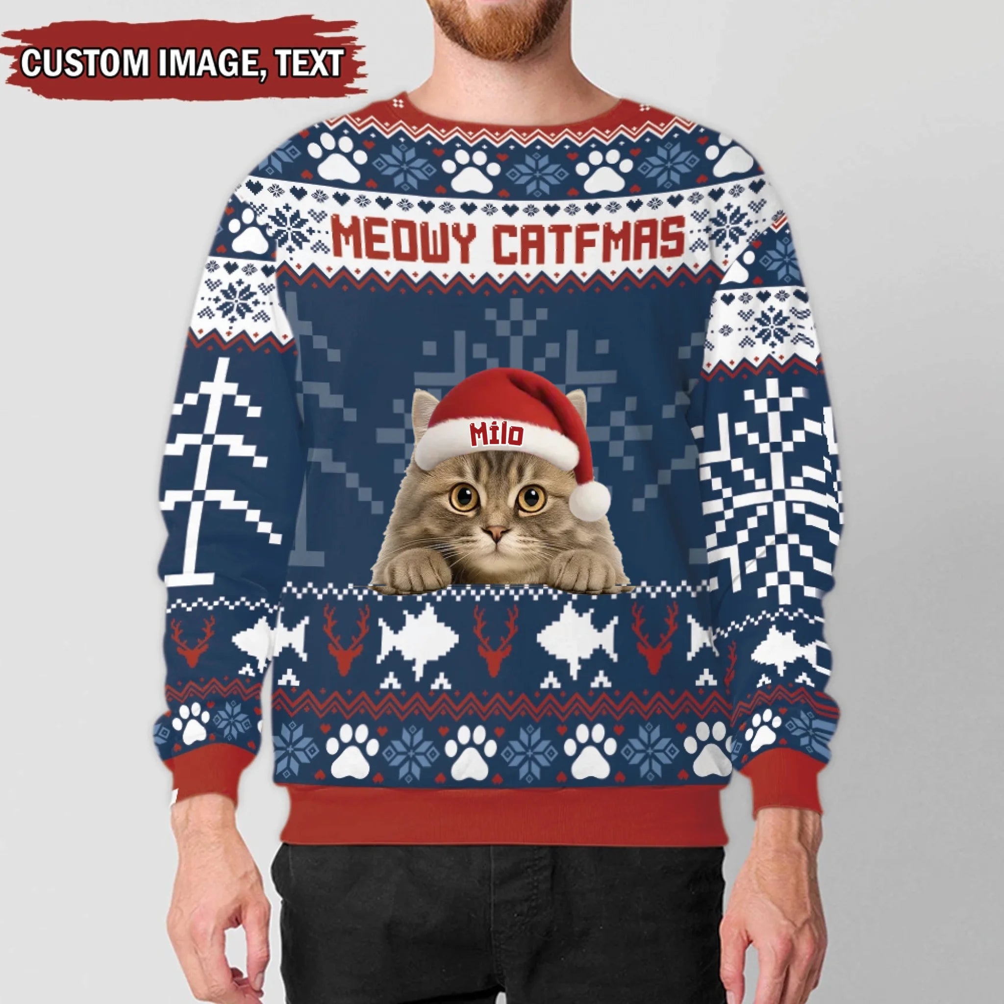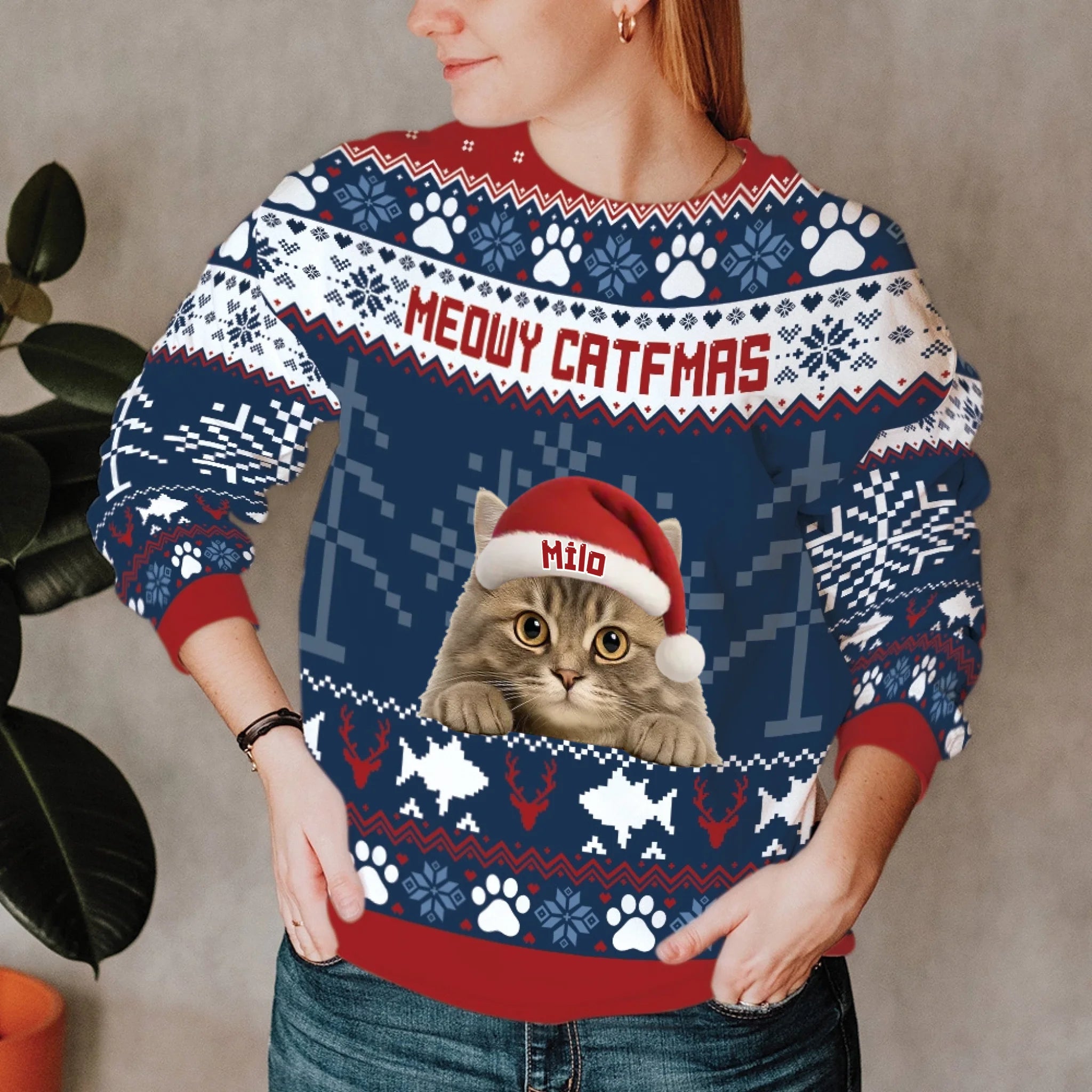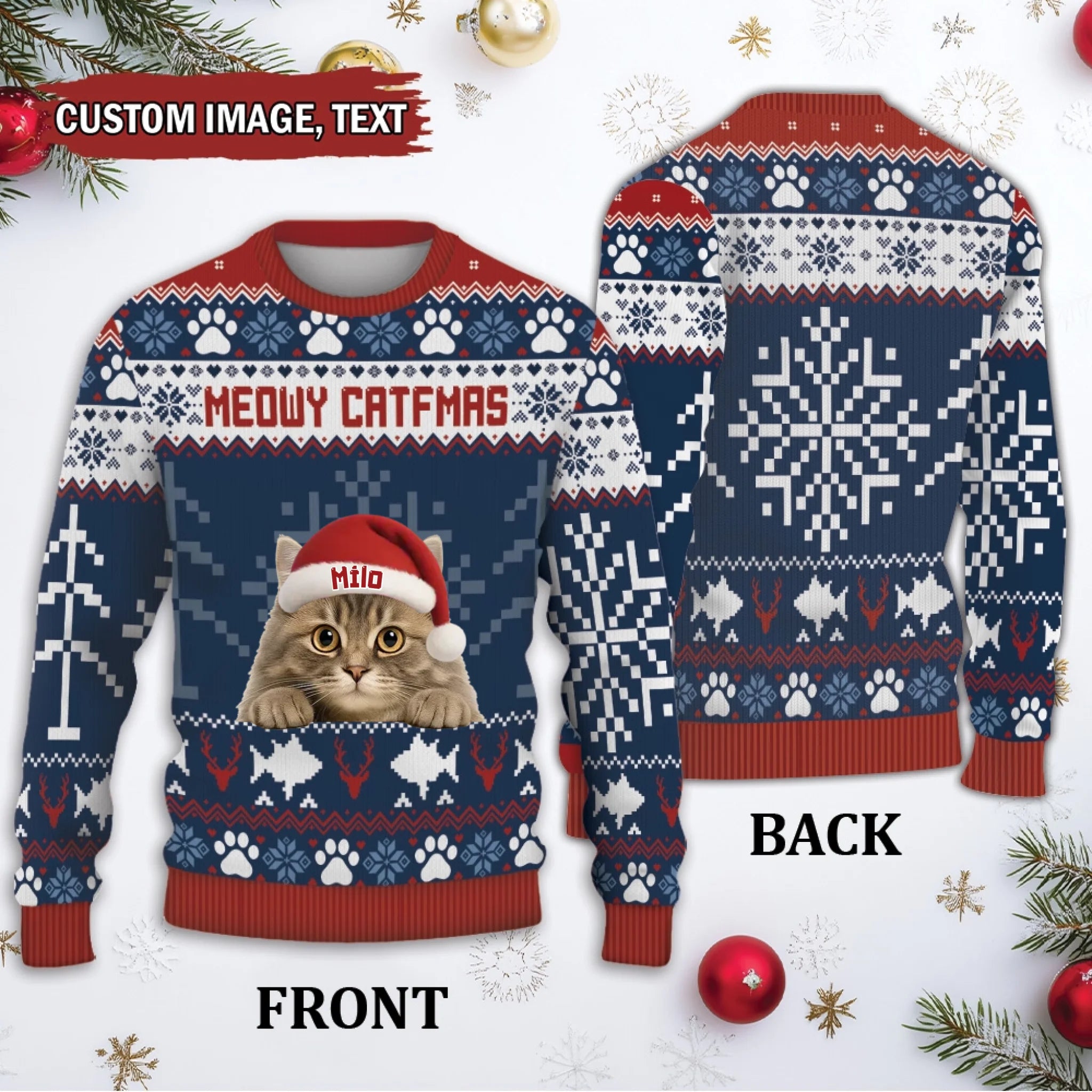 Custom Pet Cat Face Family Ugly Sweaters – Personalized Name & Photo “Meowy Catmas” Holiday Sweater | Funny Christmas Gift for Cat Lovers