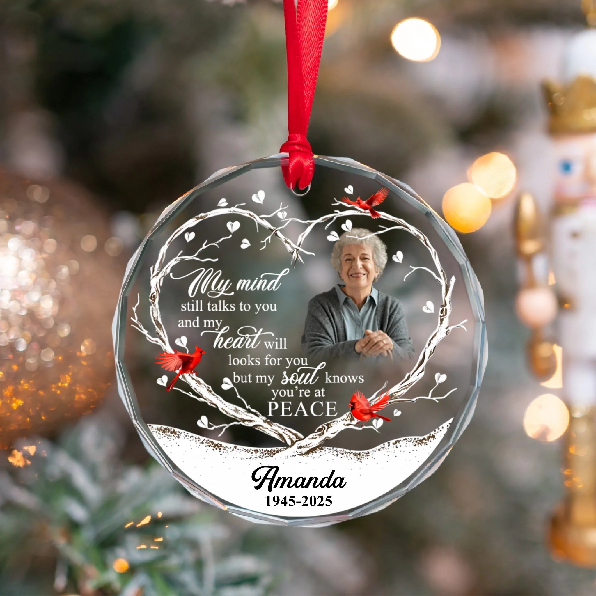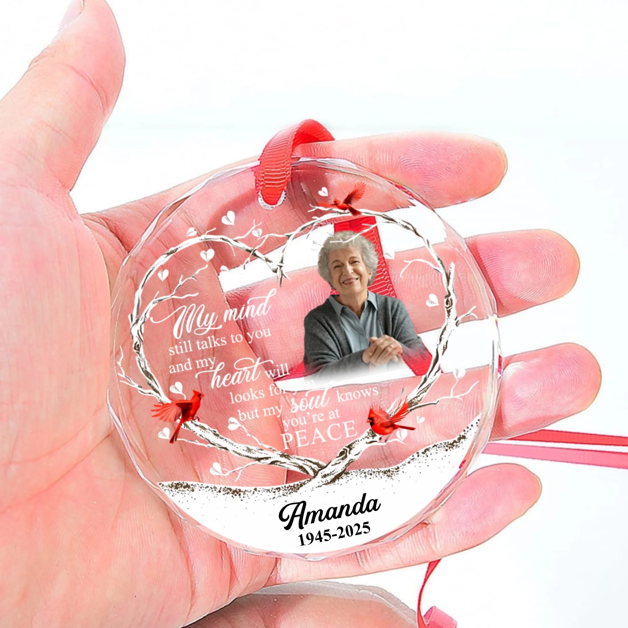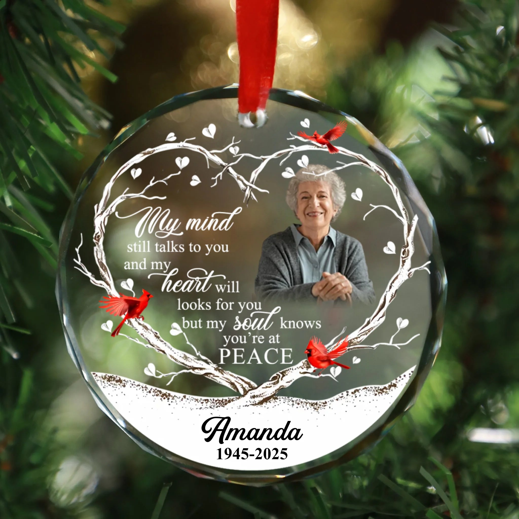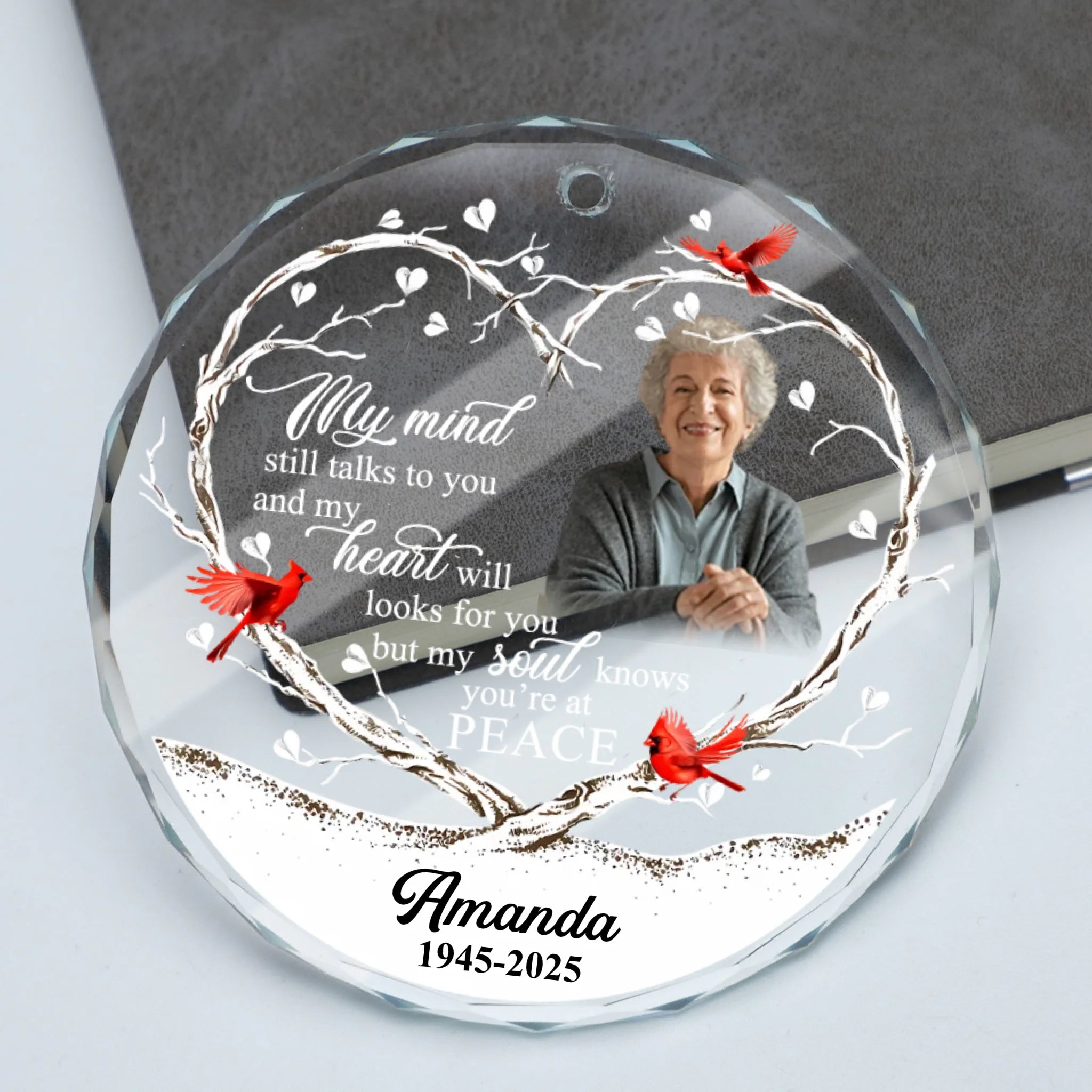 Custom Photo Memorial Round Glass Ornament - "My Mind Still Talks To You" Crystal Prism Keepsake with Name & Years