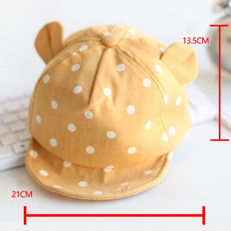 This adorable polka-dot hat is perfect for toddlers! Made from soft and breathable cotton fabric, it will keep your little one cool and comfortable all day long. With its cute polka dot design, it's not only practical but also stylish.