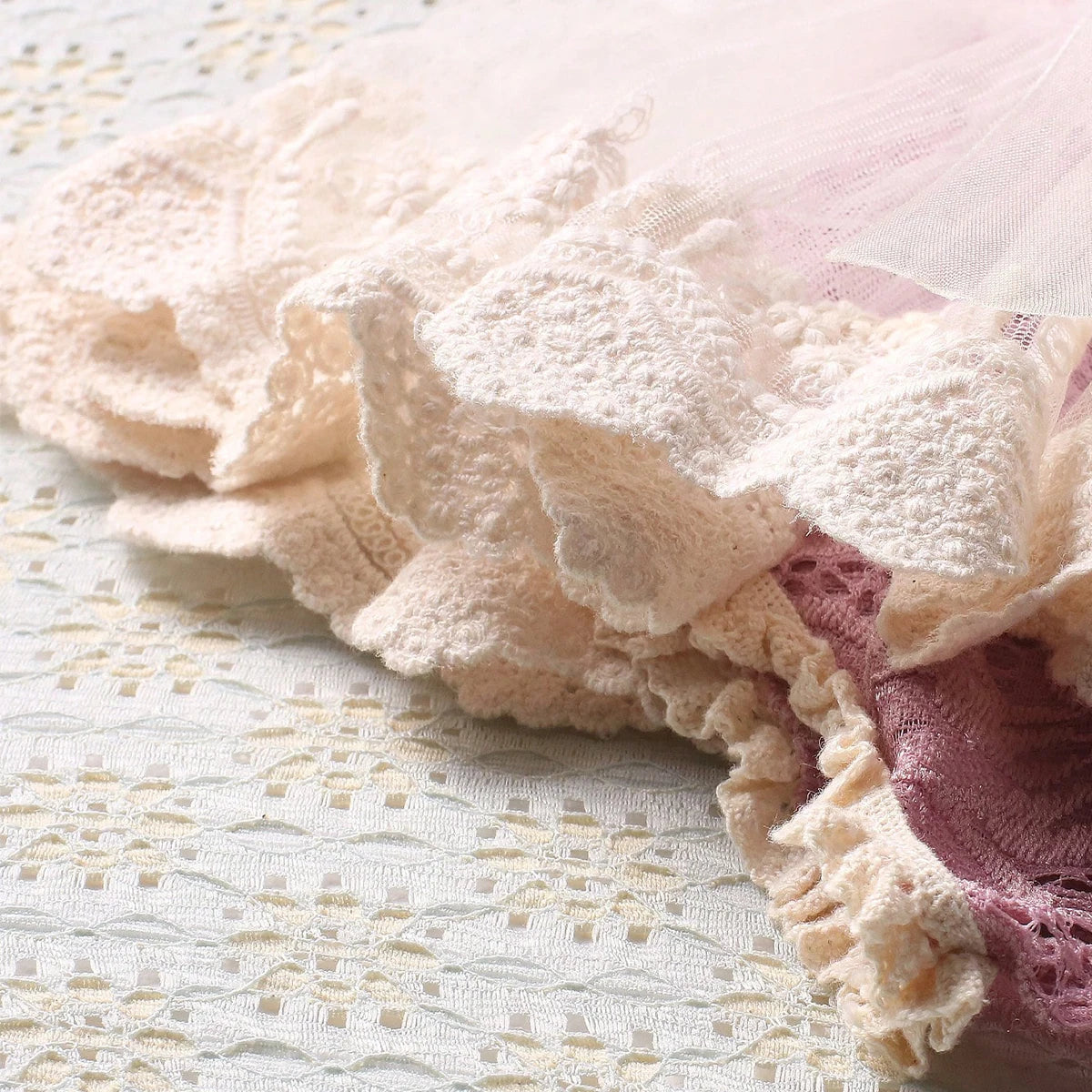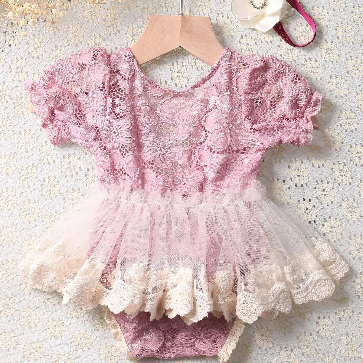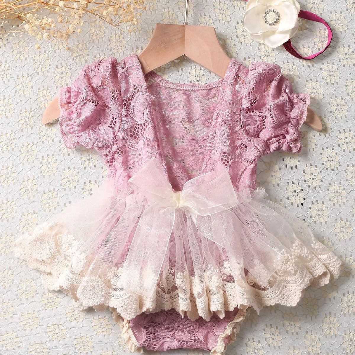 Elegant Design: Crafted in a beautiful dusty pink hue, the lace romper exudes elegance and charm, creating a timeless look for your newborn's photoshoot.