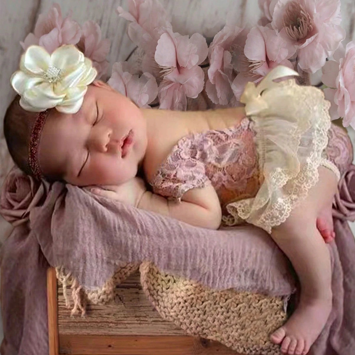 Capture precious moments of your little princess with our charming Dusty Pink Newborn Girl Photo Shooting Outfit Set. Perfect for newborn photoshoots, this set includes a delicate lace romper and adorable flower hair accessories. Here are the details: