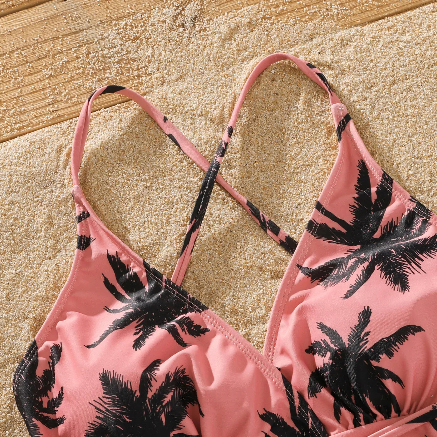 Product Introduction: Stand out from the crowd with our family matching coconut tree print swimsuit set. Whether you're planning a tropical vacation or a day at the pool, this set is sure to elevate your beachwear game. The spaghetti strap one-piece swimsuit features a bandage design and shoulder ruffles for a charming touch, while the swim trunks shorts offer a classic and comfortable fit for the whole family.