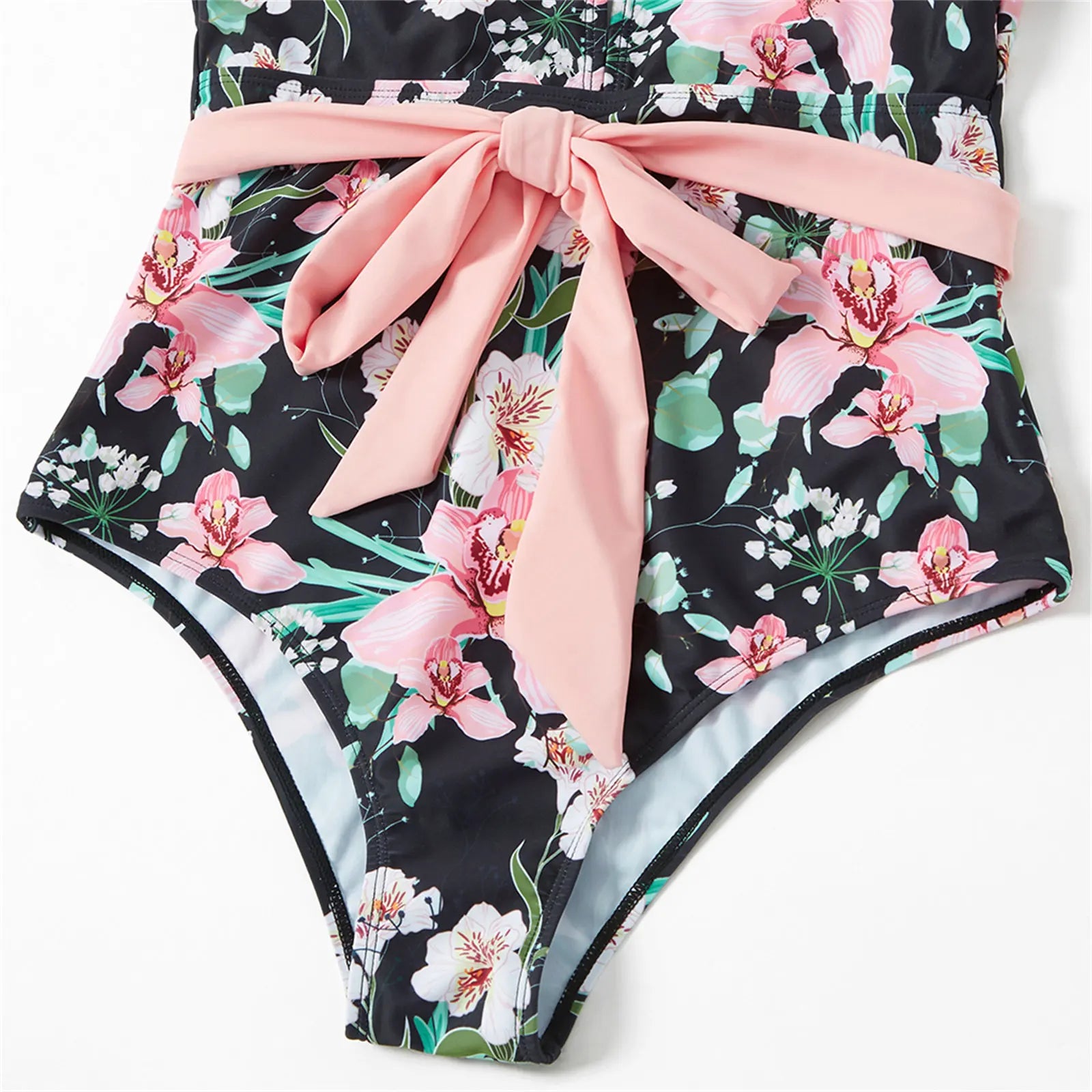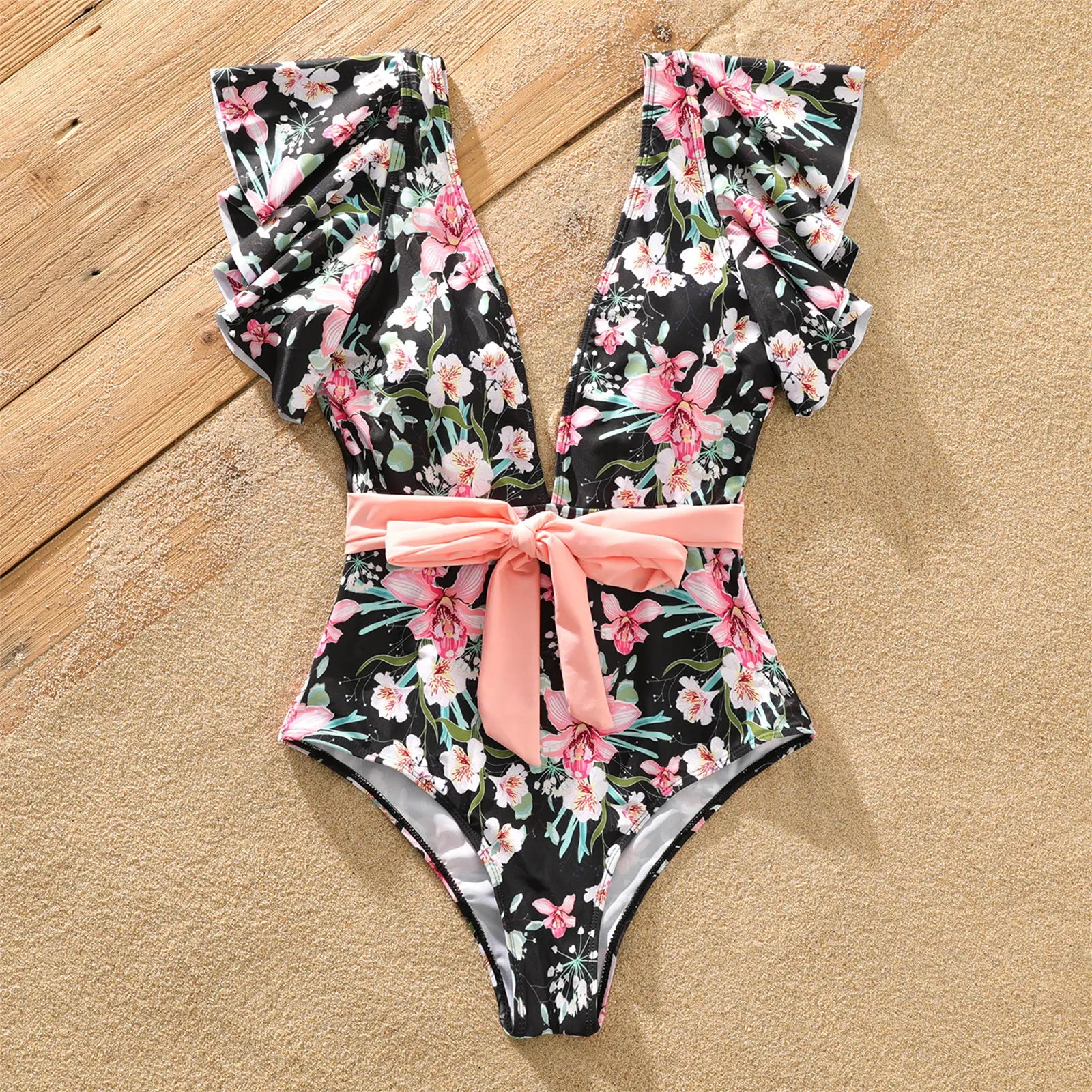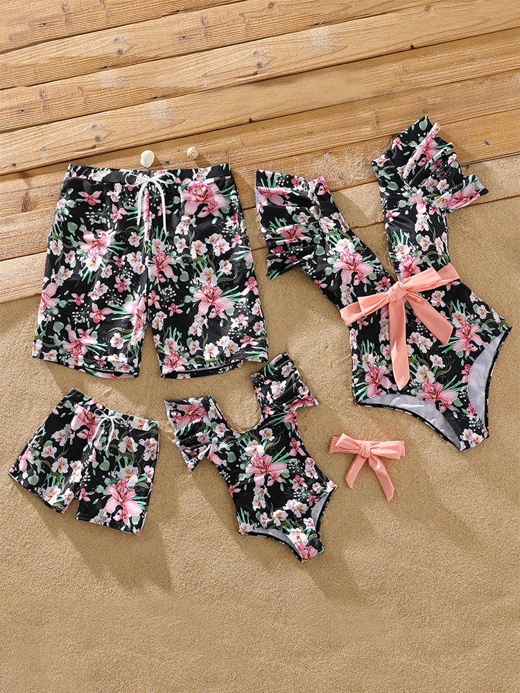Gear up for unforgettable summer moments with our Family Matching Allover Floral Print Swim Trunks Shorts and Ruffle-Sleeve Belted One-Piece Swimsuit. Whether you're hitting the beach or lounging by the pool, this matching set is a must-have for the whole family.