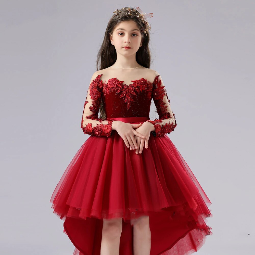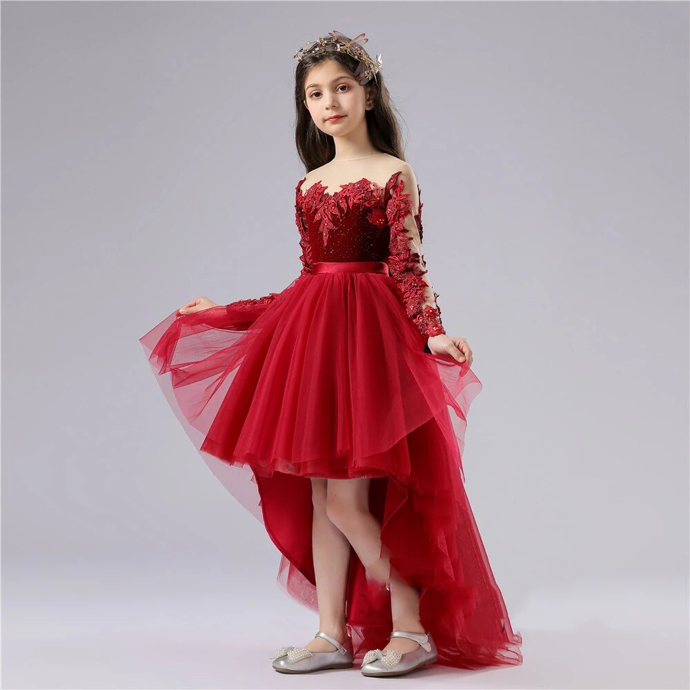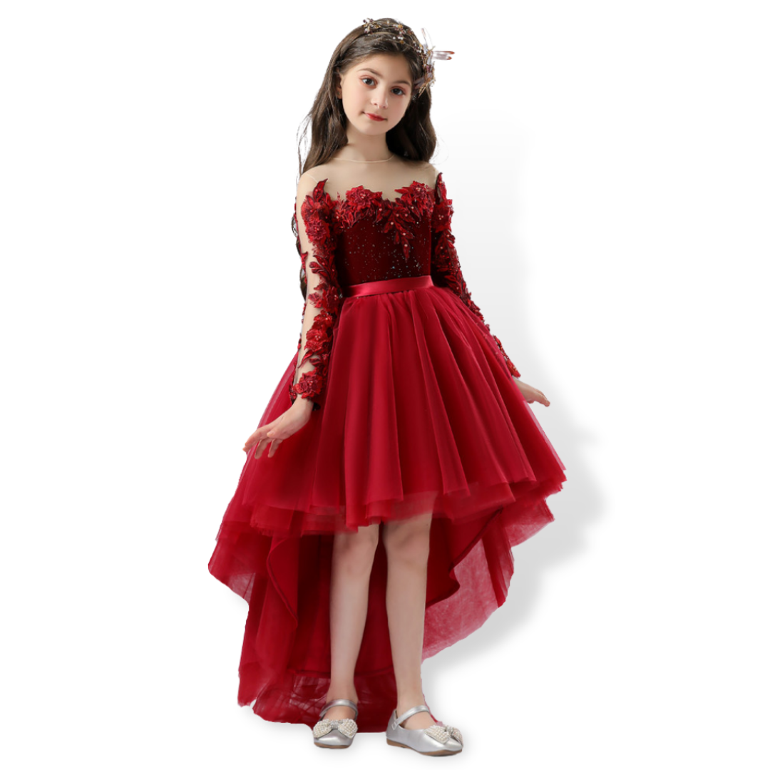 Let the crowd admire your little lady with this Fiery Red Detailed Floral Lace Design Princess Party Dress. It is uniquely designed with see-through sleeves, lace flower embellishments, and bead appliques that make it look stunningly gorgeous and attractive for that perfect fiery princess look! Sizes are available for toddlers to teens.