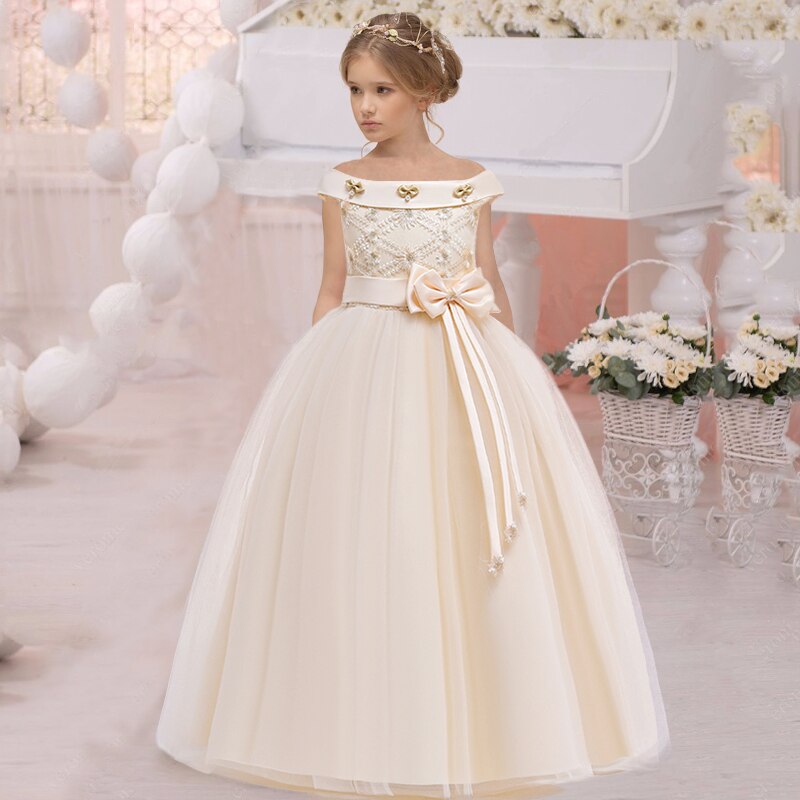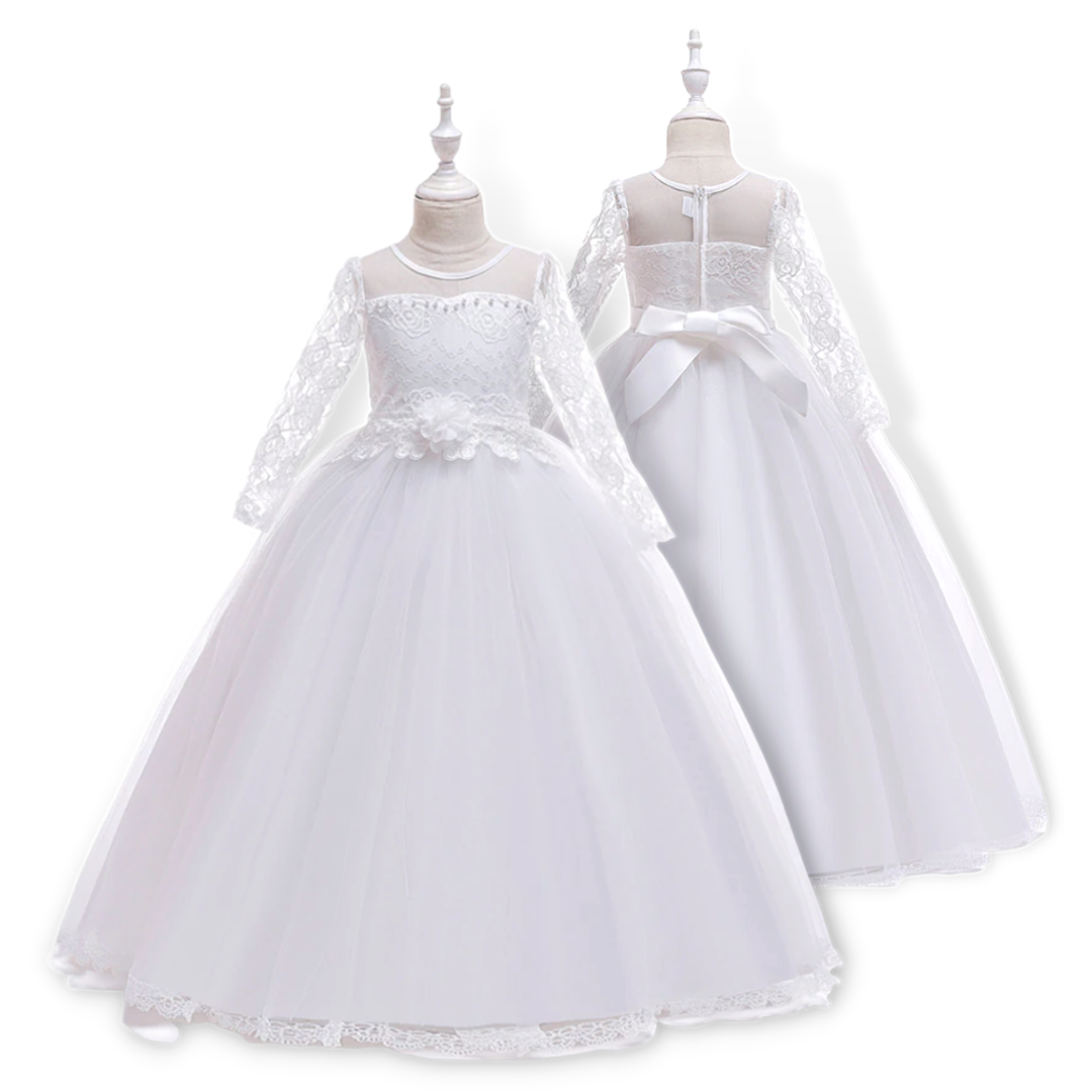 Floral Lace Top Long Sleeves Girls Elegant White Gown