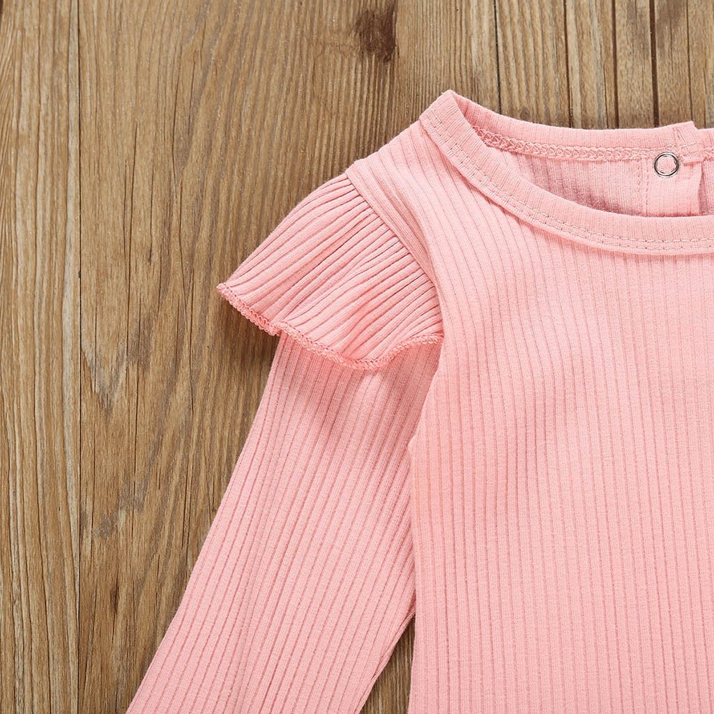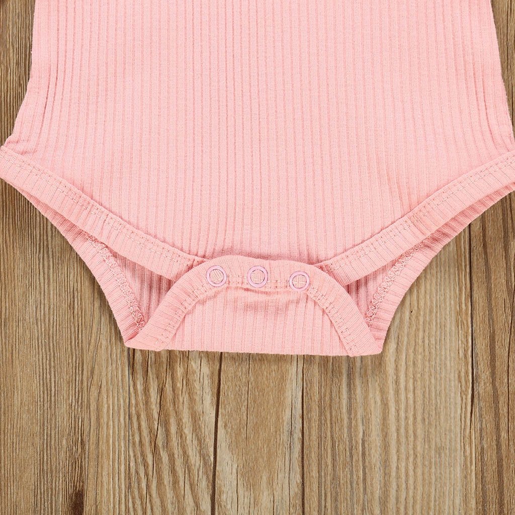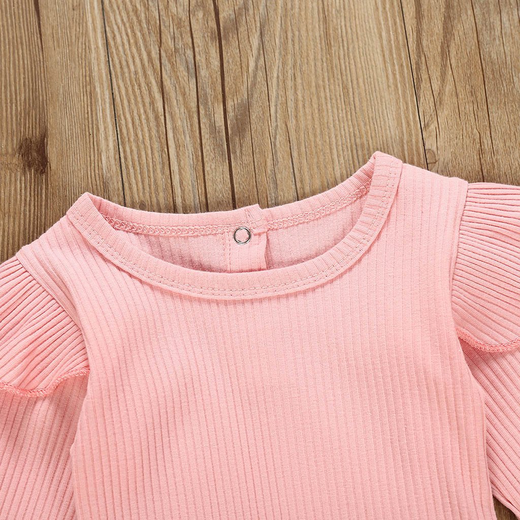 The romper has ruffled shoulders with long sleeves that give it a trendy appearance. The poppers make diaper changes swift and the buttons at the back allow easy dressing. The cotton blend fabric makes the outfit preferable for outdoor activities.