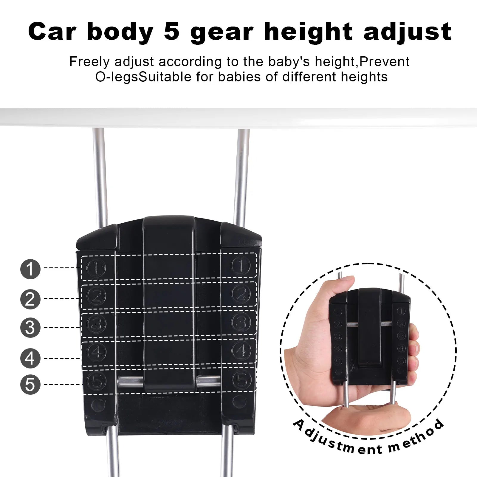 5-Level Height Adjustable: The height of the walker is adjustable in 5 levels (implied by the adjustable height range of 14.17 in ~ 17.71 in), ensuring proper fit and comfort for babies of different heights.