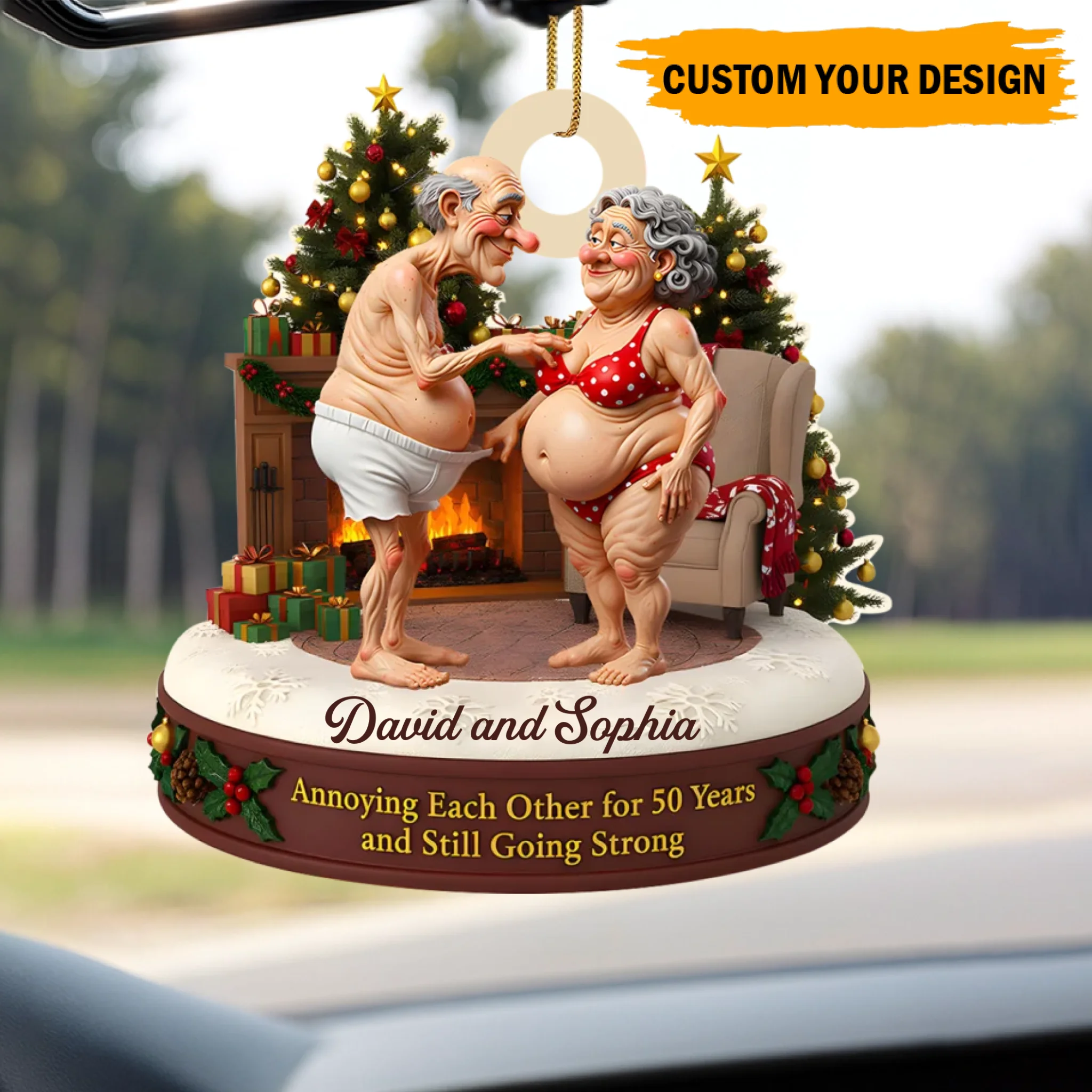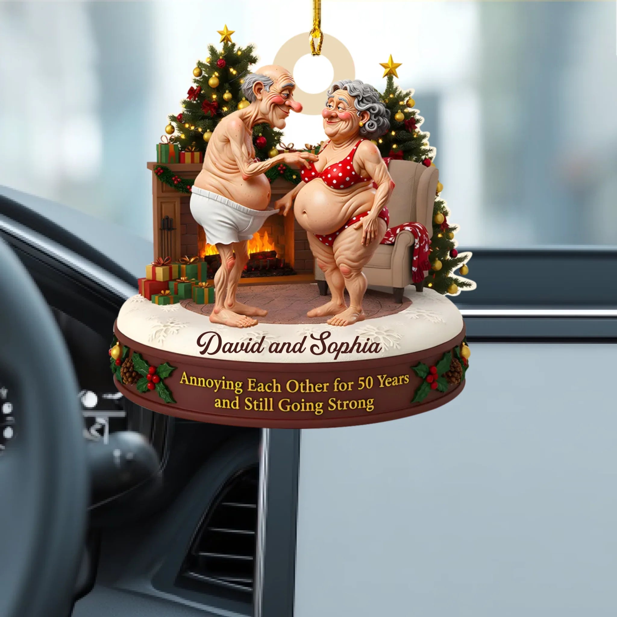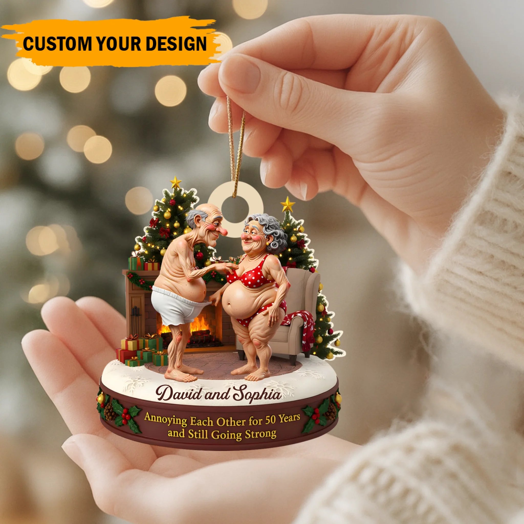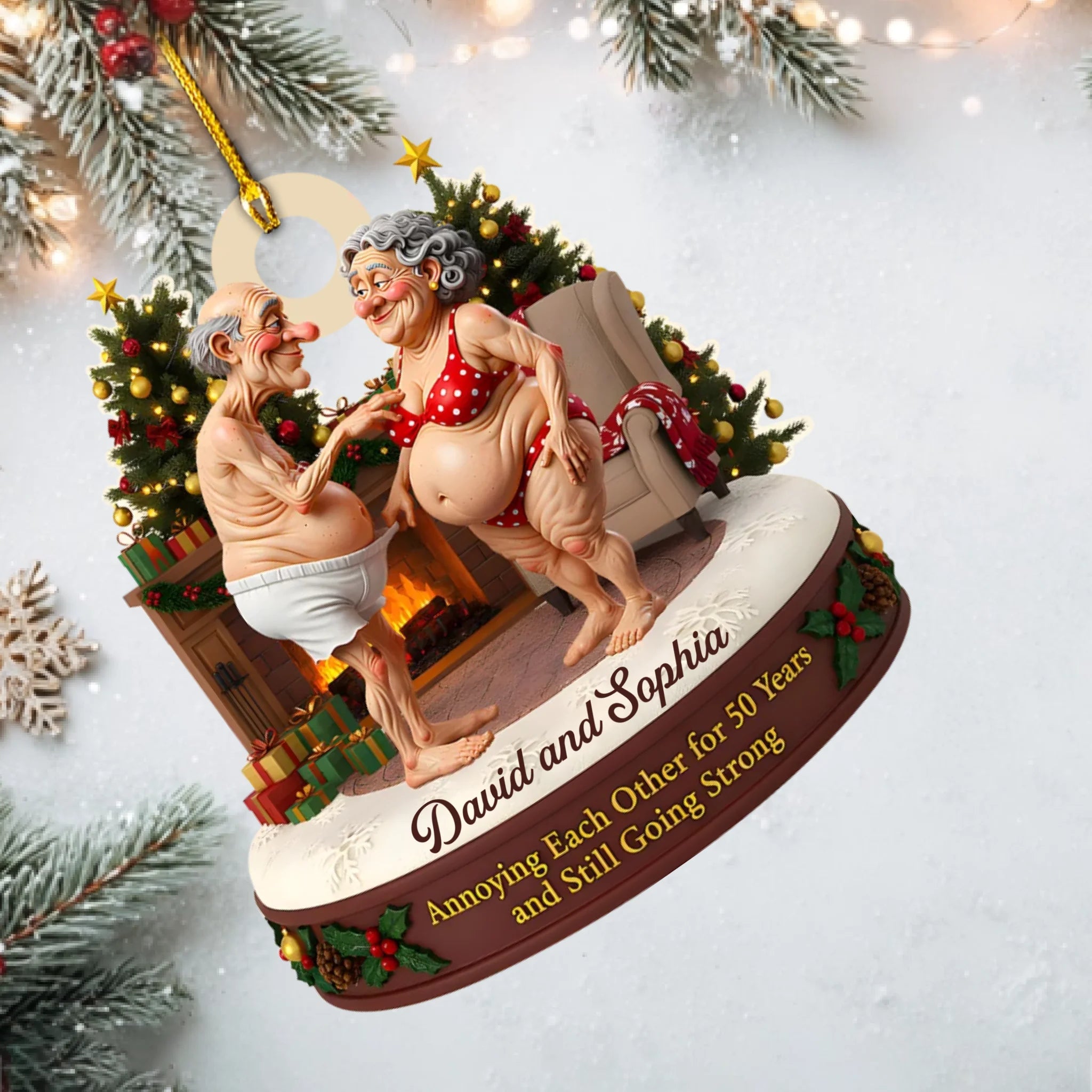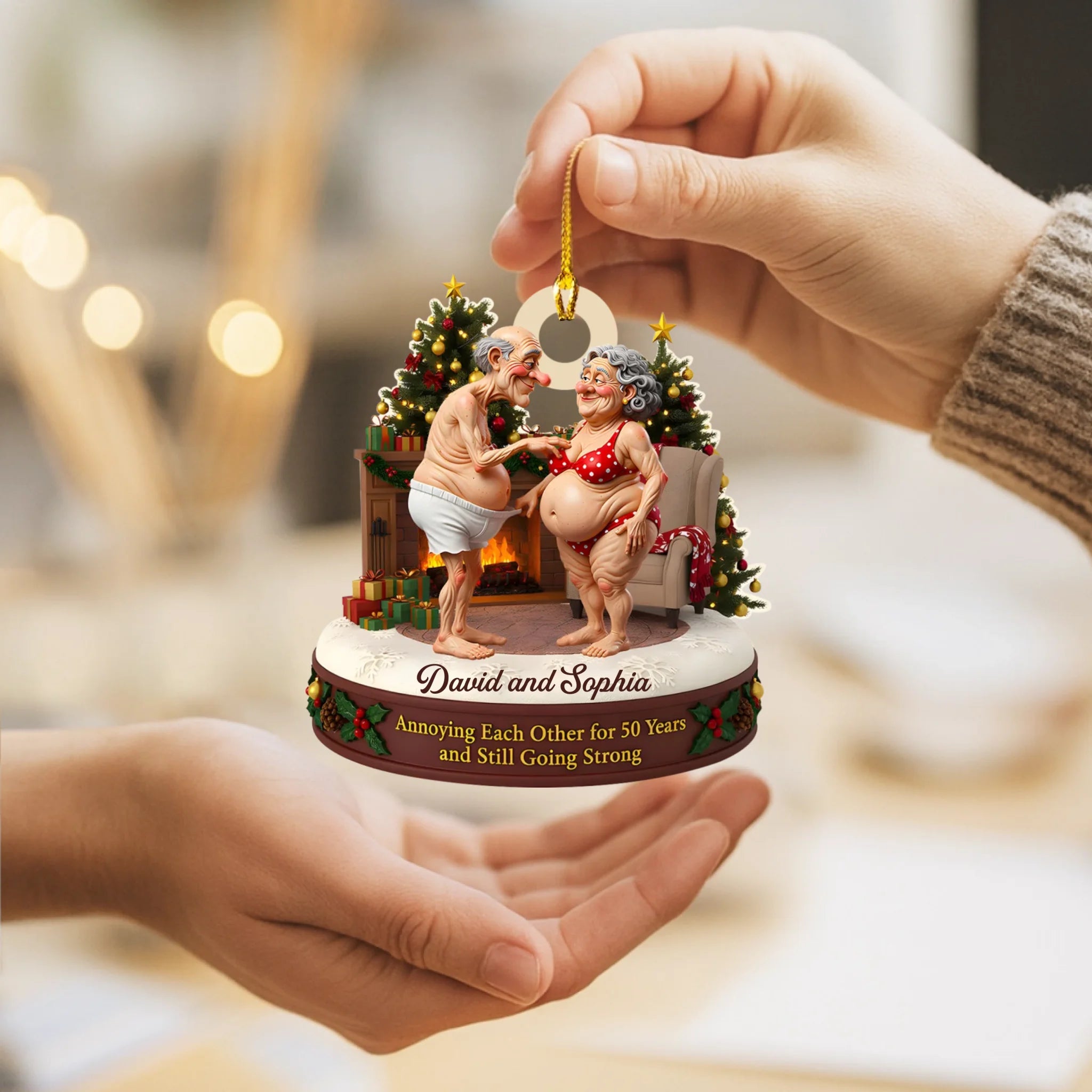 Featuring a humorous elderly couple in a lighthearted scene, this ornament captures the joy of growing old together — still laughing, still loving, and still annoying each other after all these years.