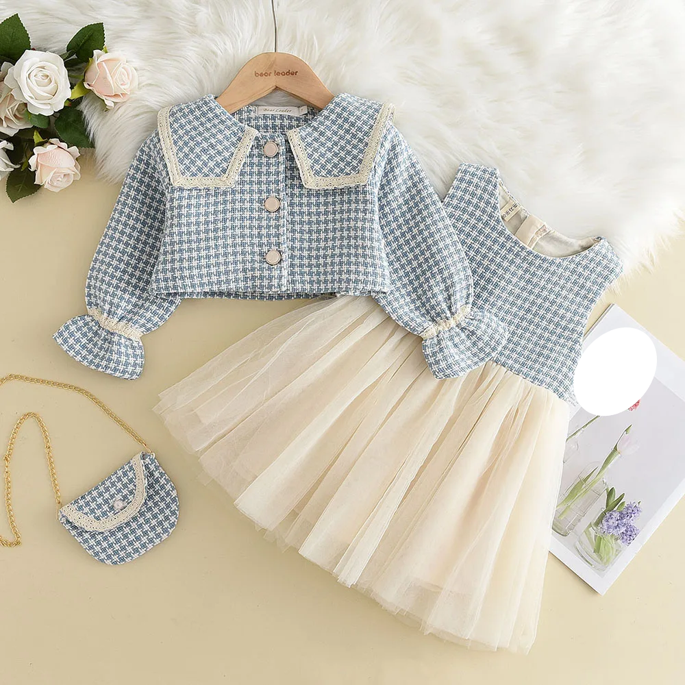 Our Girls' Checkered Tank Dress + Retro Coat Set is a perfect blend of comfort and elegance. The turn-down collar, single-breasted closure, and plaid pattern make this set ideal for both casual and special occasions.