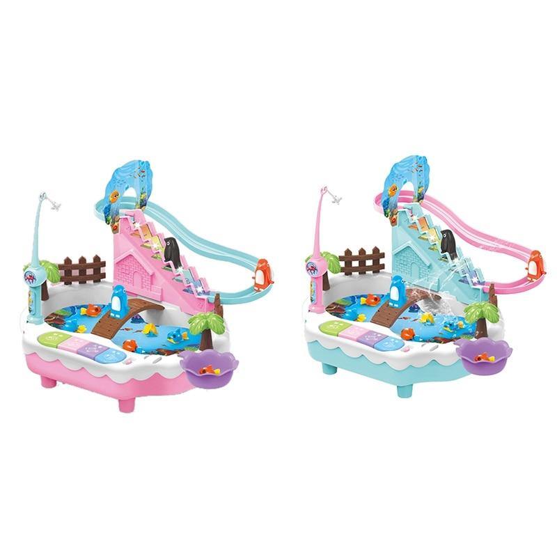 It is made from kid-friendly plastic and has many brightly colored fishes and penguins in a marine life environment. The toy set makes children learn to differentiate between colors. The penguins automatically glide up the stairs and down the smooth track. With the entire setup, the set enhances the kids’ imaginative powers and lets them play creatively. The pool is filled with water to keep the toy fishes in it. The toy set allows the kids to learn the art of fishing by using the toy fishing rod to capture the fish. It improves their hand-eye coordination and motor skills. It has four buttons for different kinds of songs and music, all meant for the entertainment of kids while they play.
