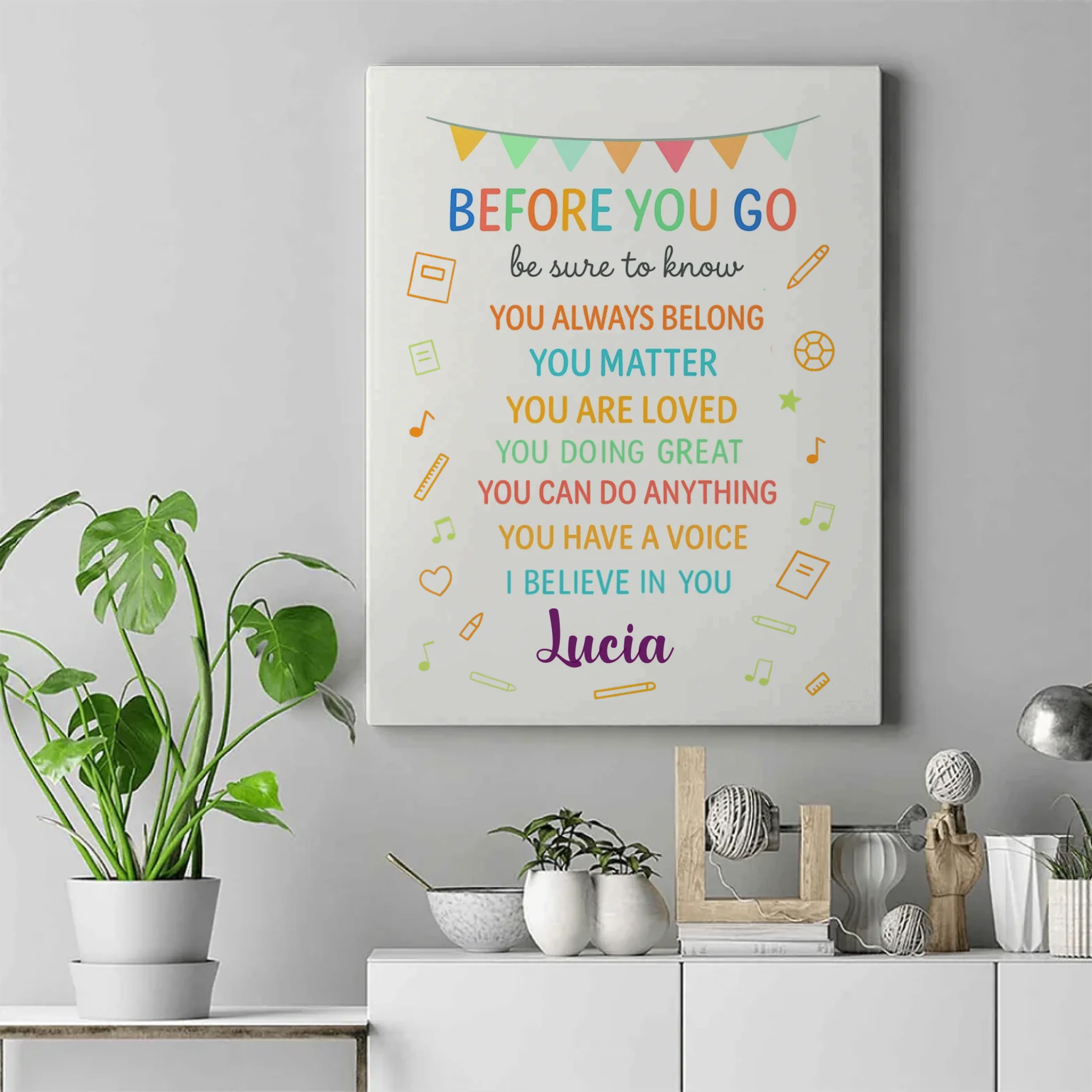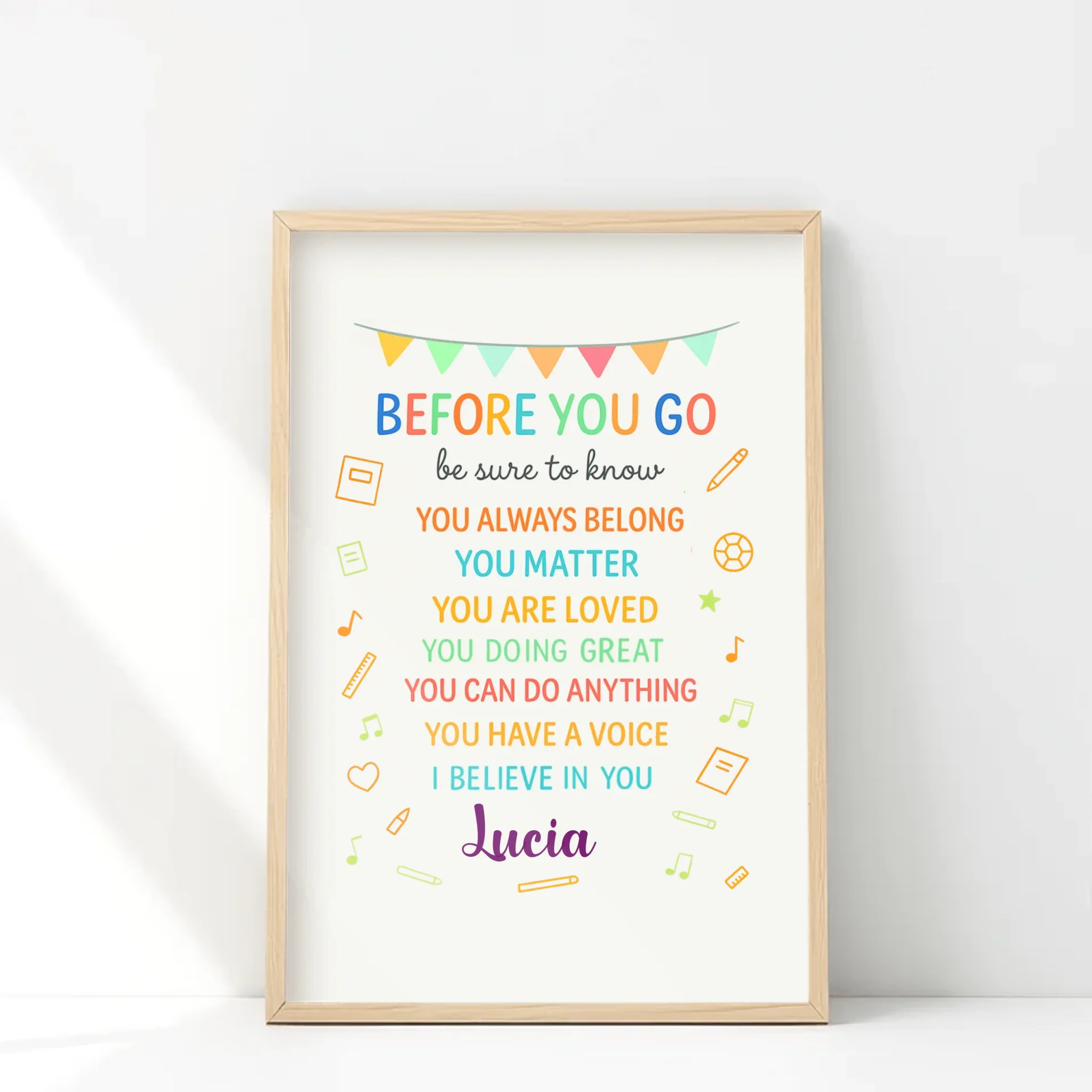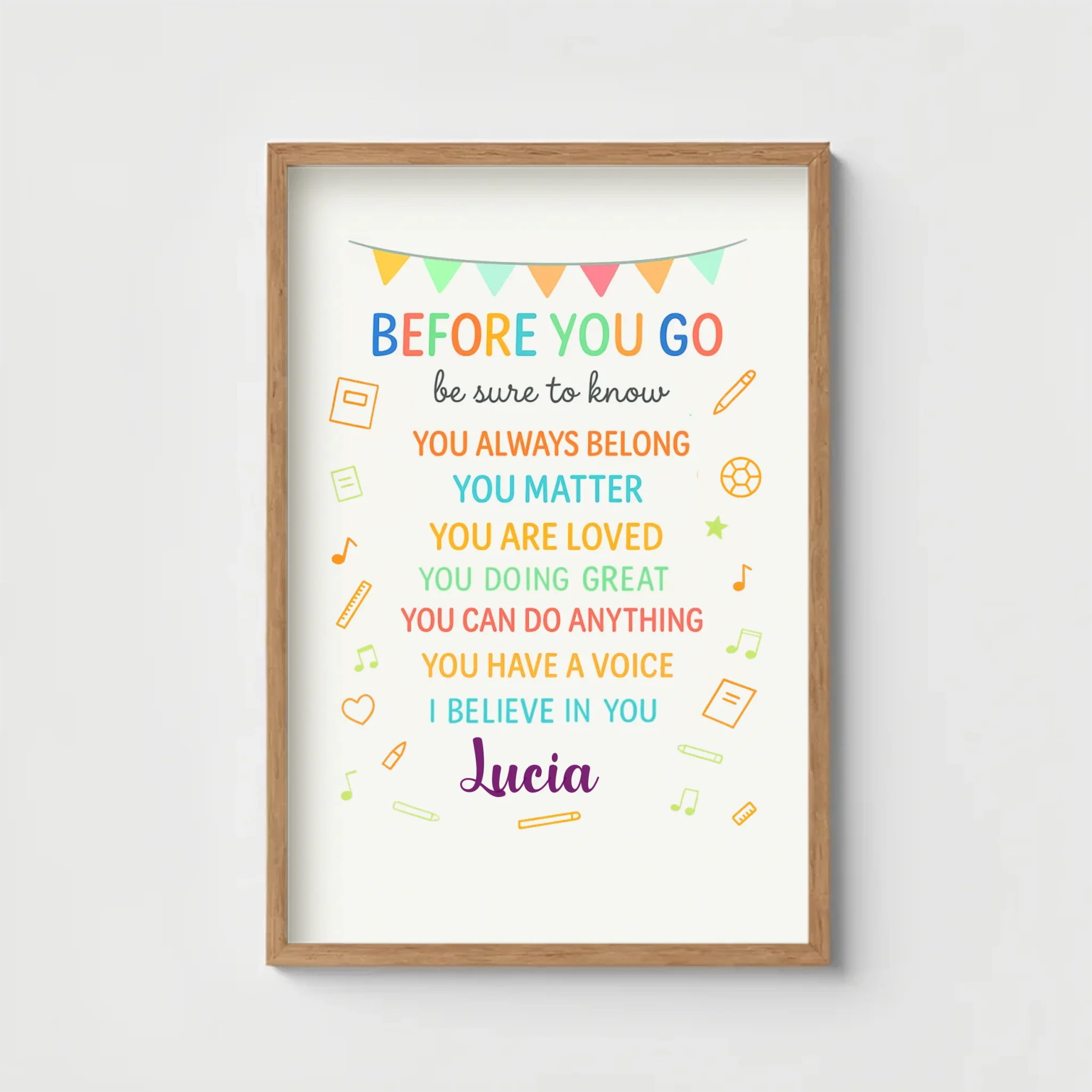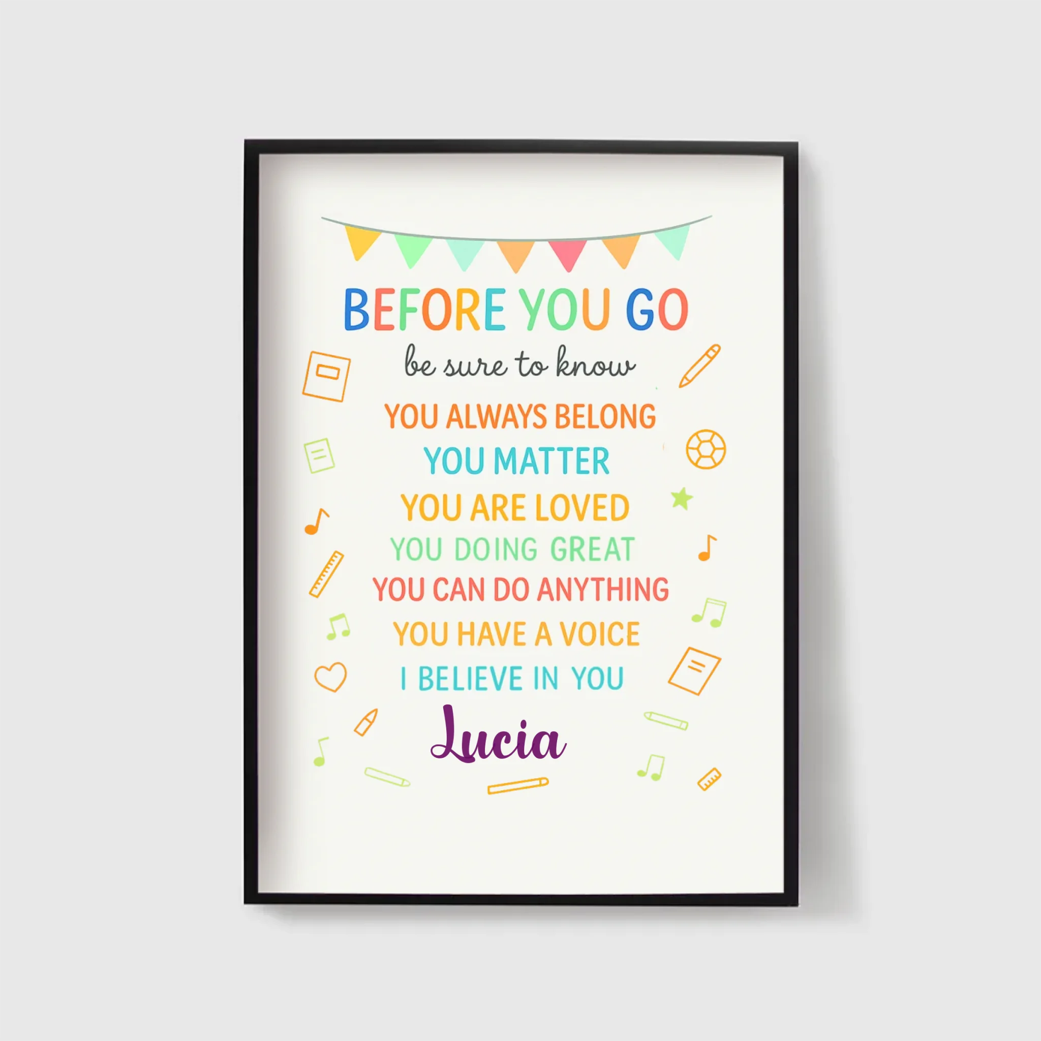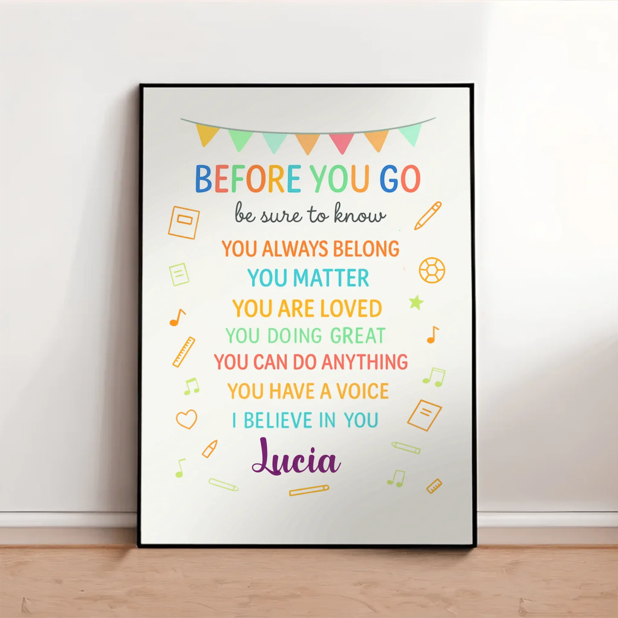 Fill your walls with positivity and encouragement with our “Before You Go” Personalized Poster. Designed with uplifting reminders like “You Matter, You Are Loved, You Can Do Anything”, this piece is perfect for classrooms, kids’ rooms, or any space that could use a daily dose of inspiration.