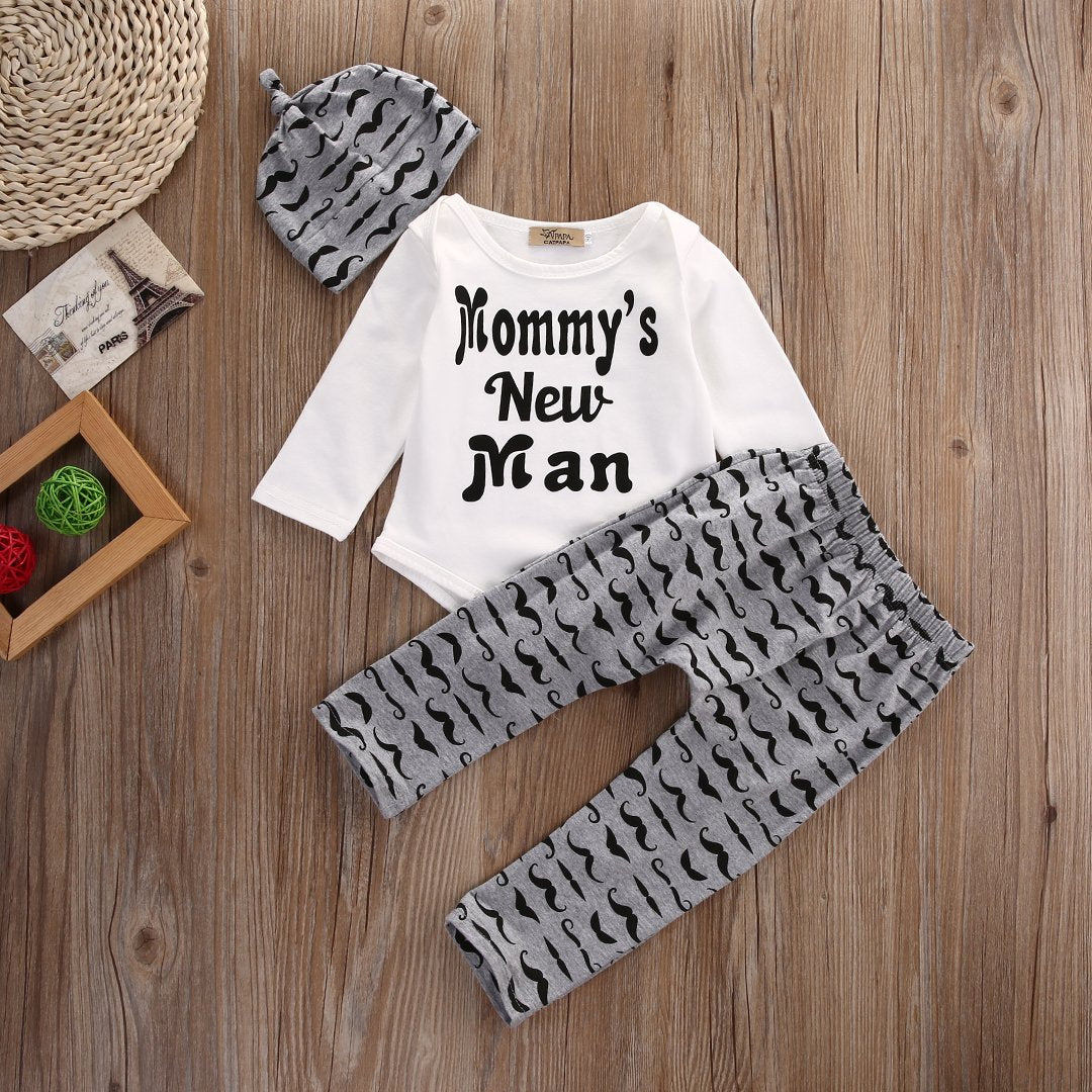 For every mother, it is the ultimate curiosity to see her son a grown man. Make yourself feel the same way with our "Mommy’s New Man" 3 piece set. It has printed Mommy's New Man on the romper and mustaches printed on the hat and pants. Its cozy material will make him feel plush and secure.