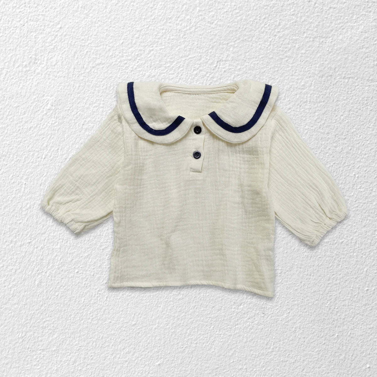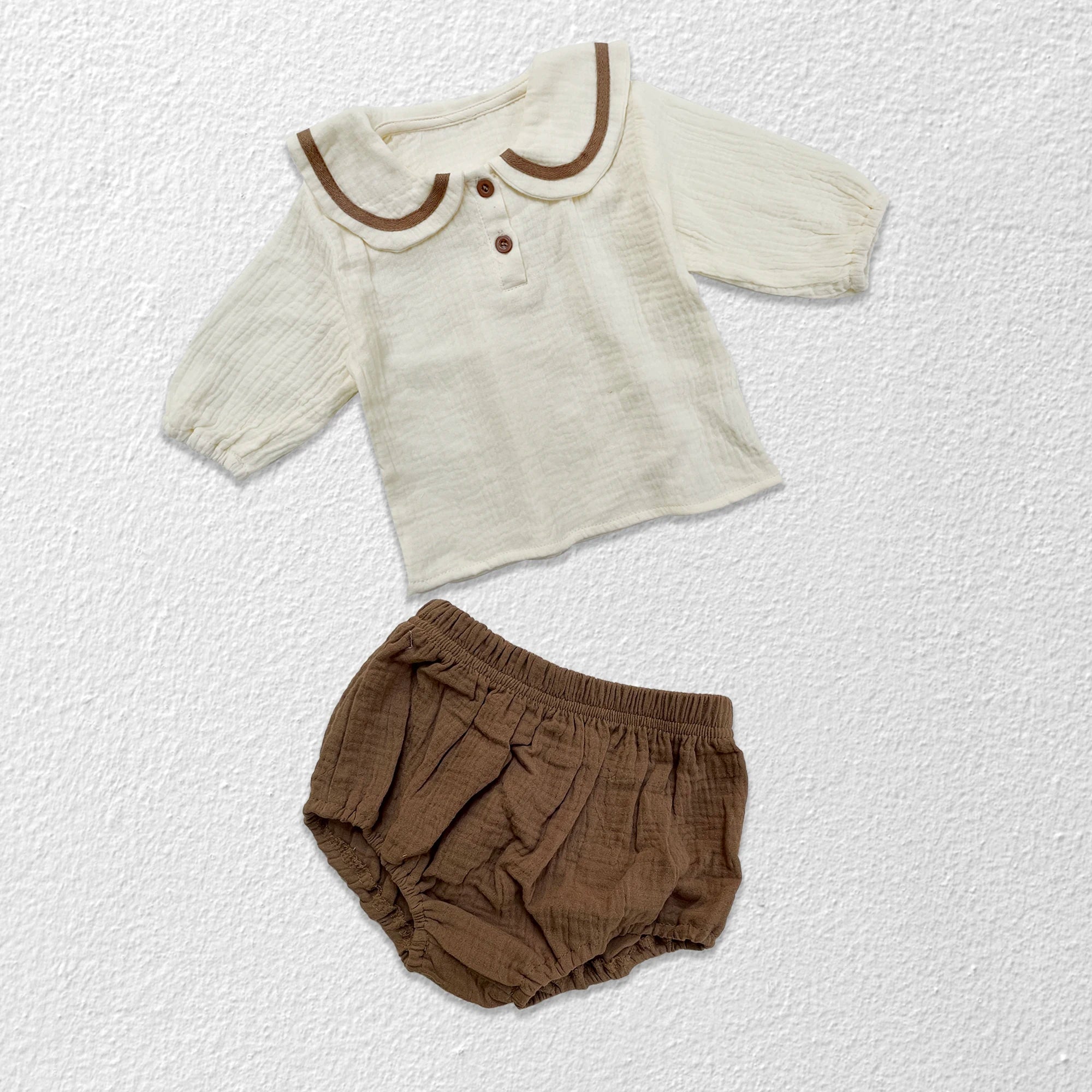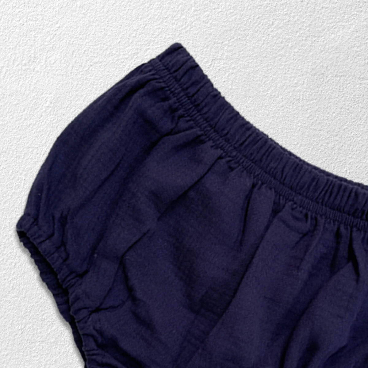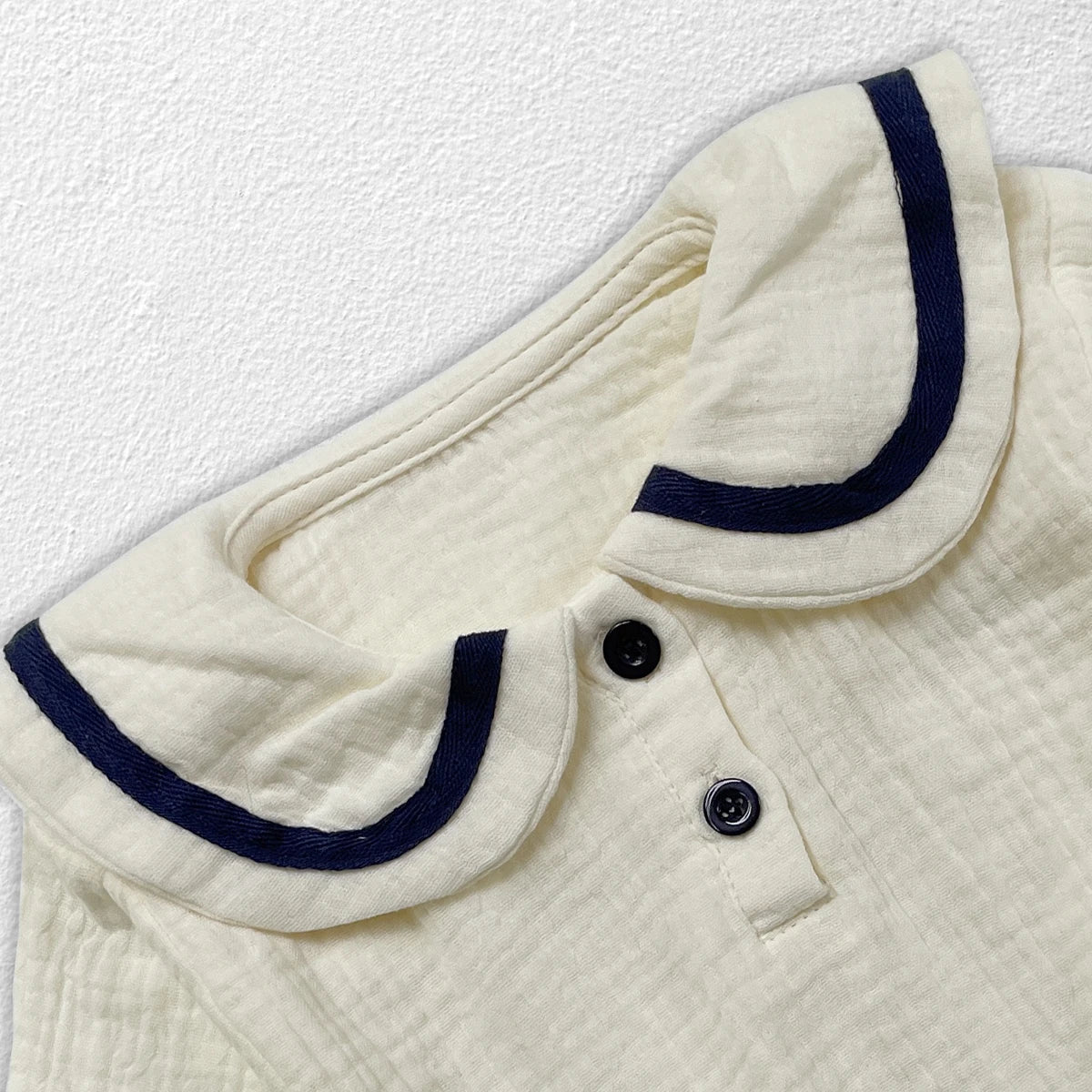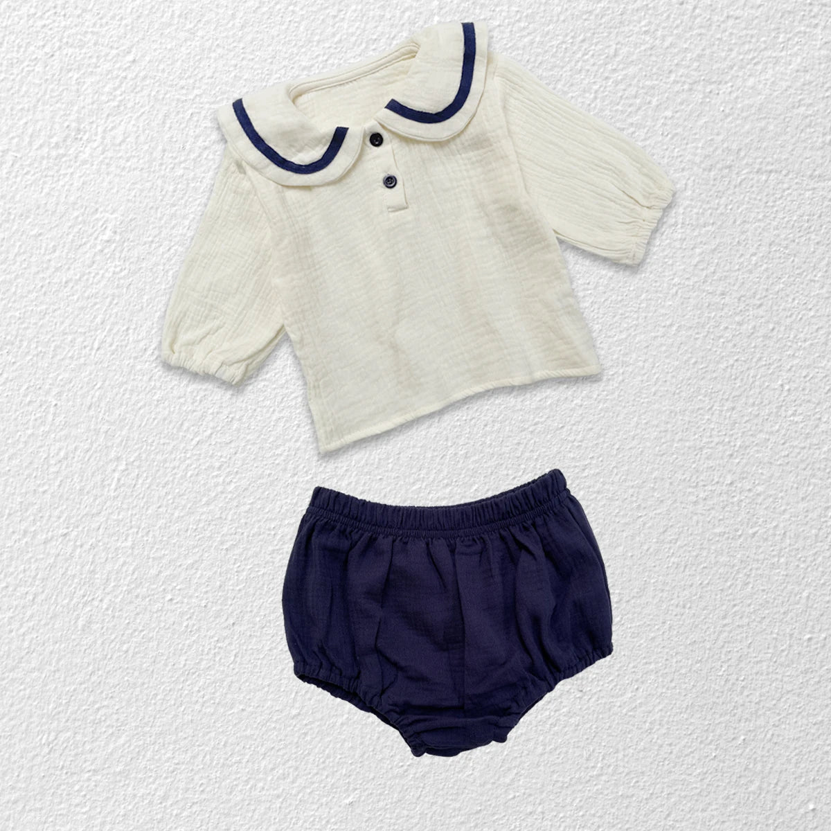 Designed with care, this set includes a Turn-down Collar Navy Top and Solid Bread Bottoms, creating a trendy and adorable ensemble for your baby.