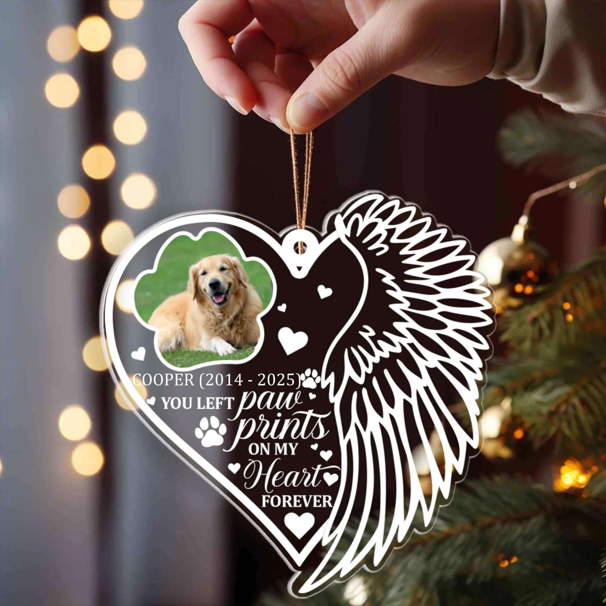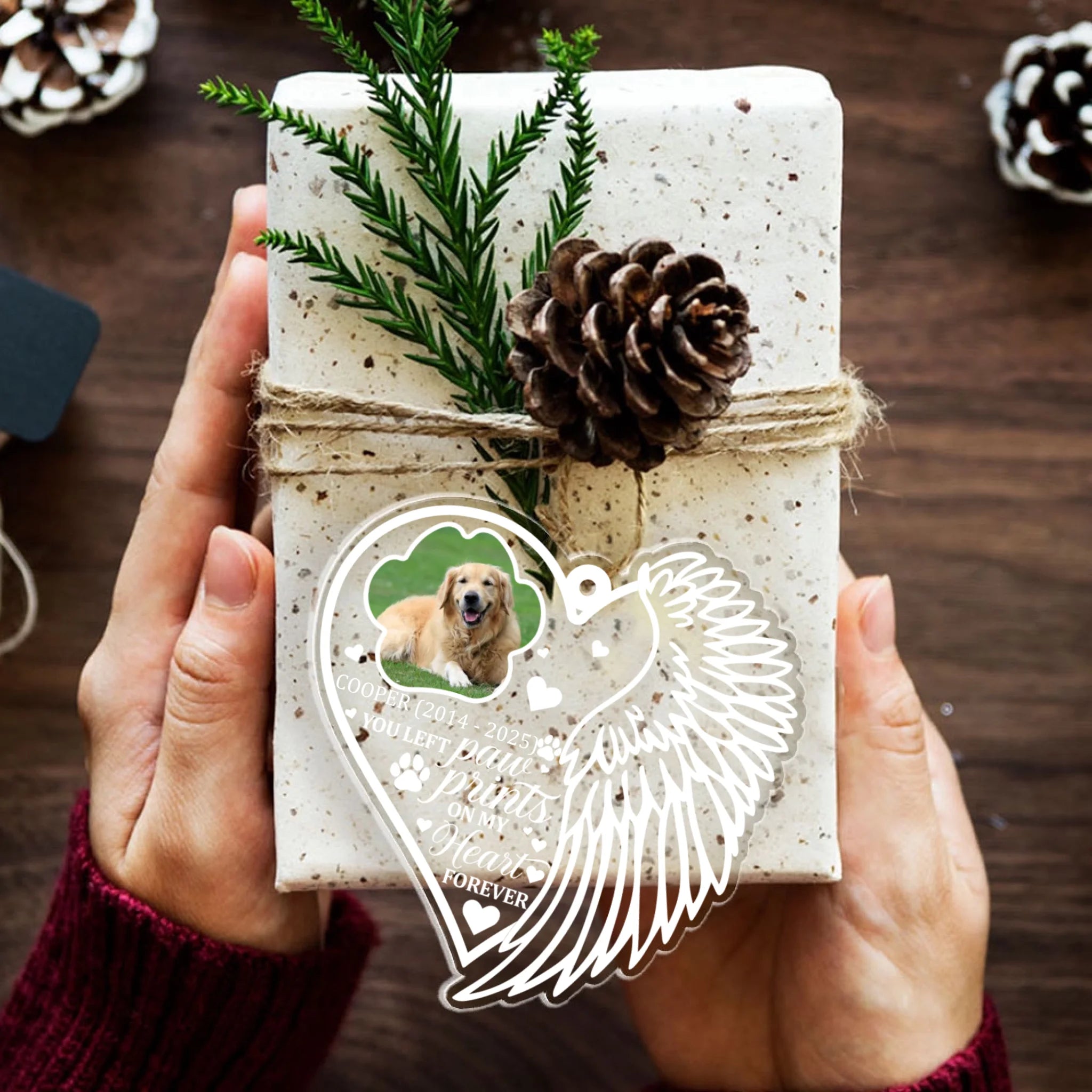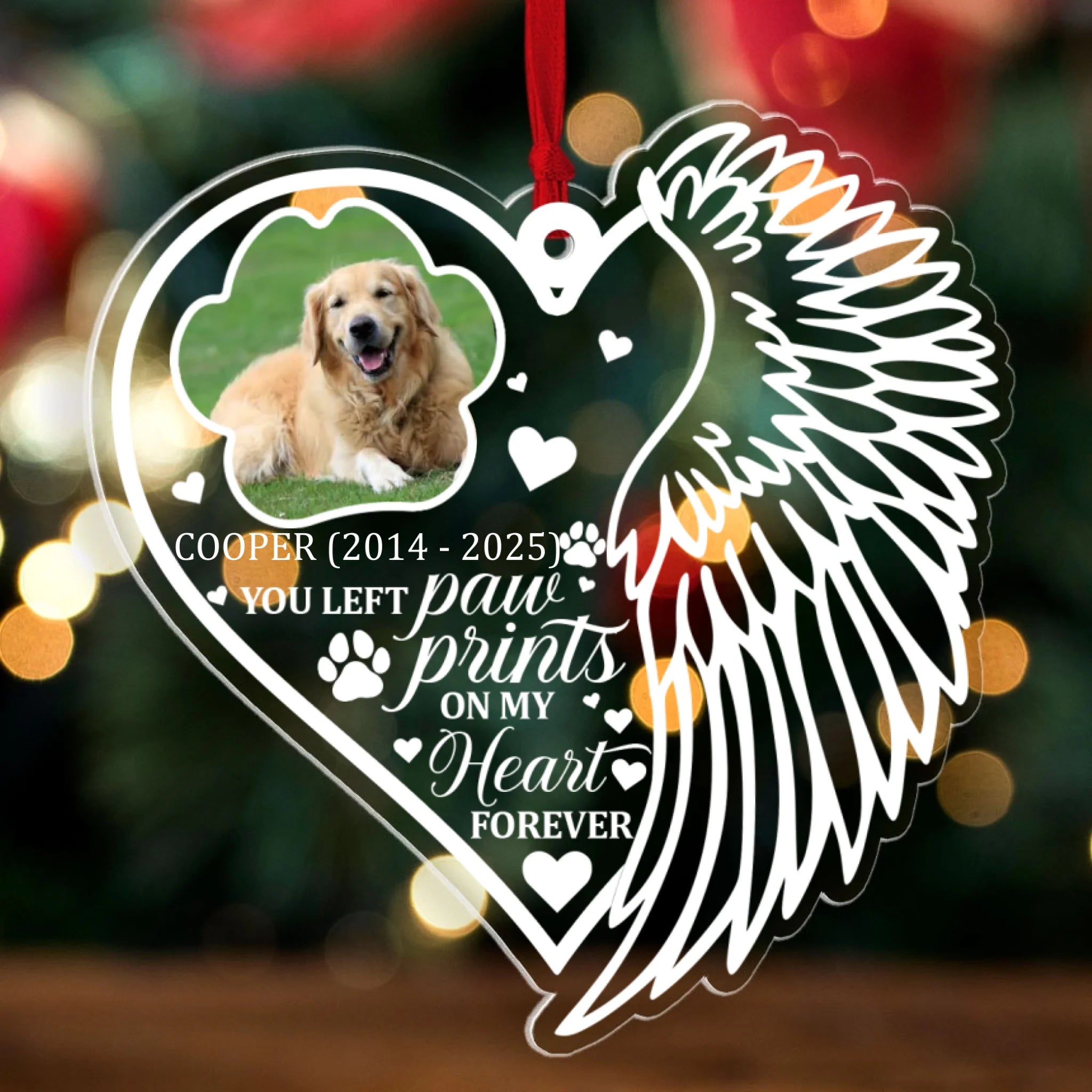 Personalized Dog Memorial Acrylic Ornament - Custom Photo Heart Wings Keepsake: "You Left Paw Prints on My Heart Forever"