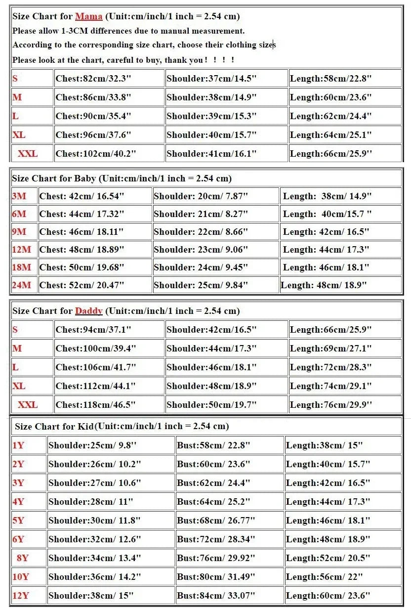 To create a full family matching set, please choose and add each size separately (Mom + Dad + Kids + Baby).