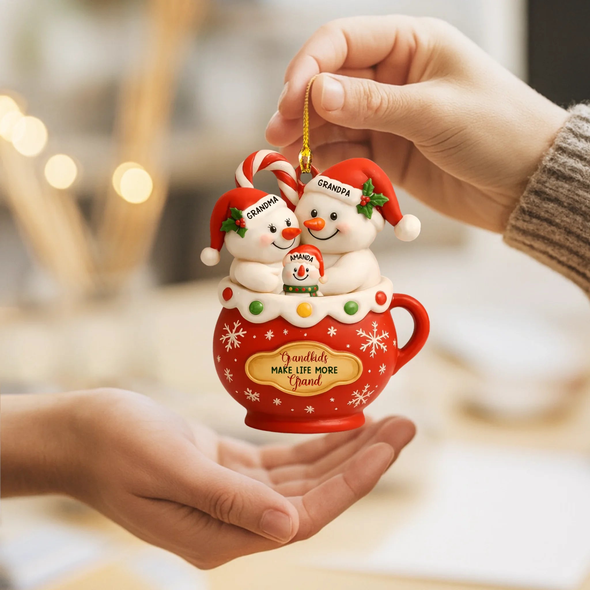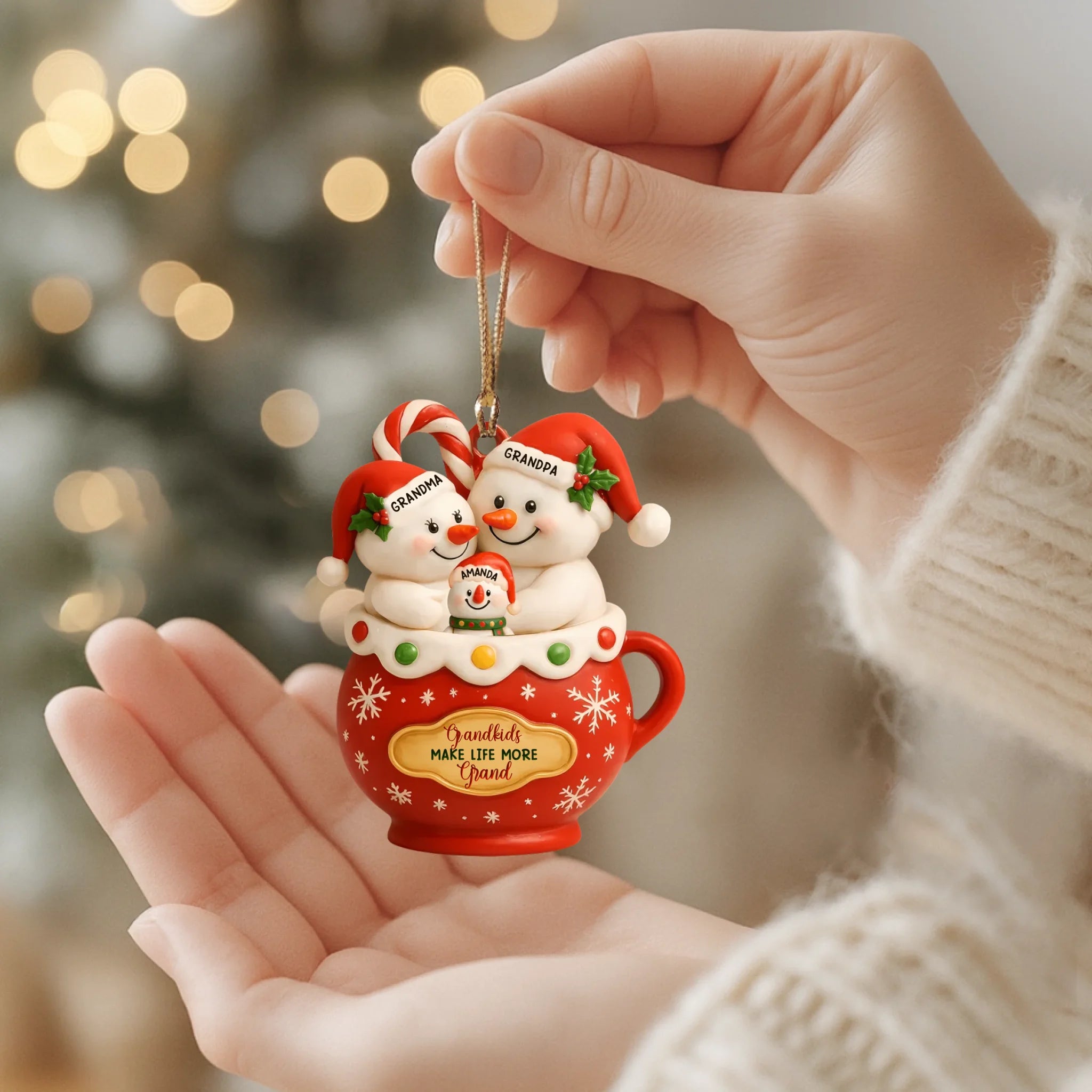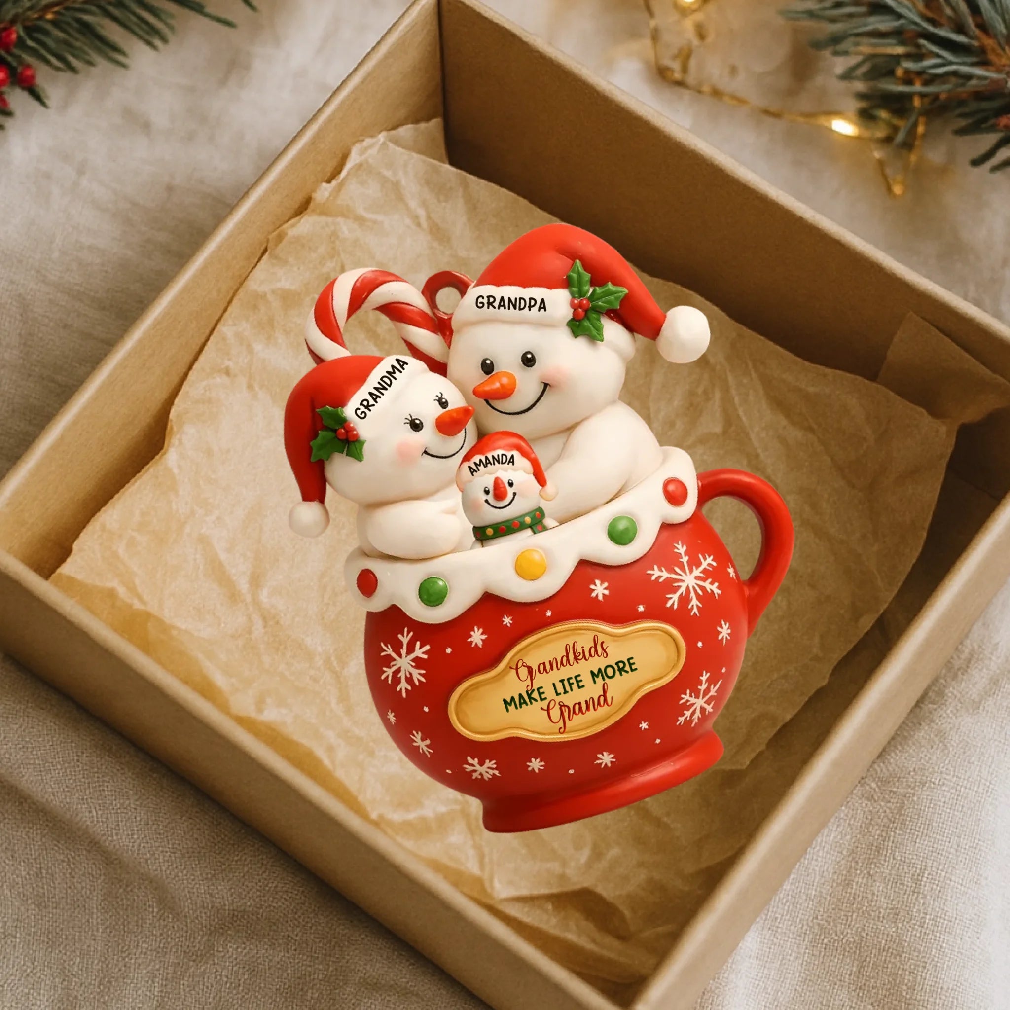 Featuring adorable snow grandparents and grandkids sitting together in a festive red mug, this ornament perfectly captures the joy and love that make family moments unforgettable.