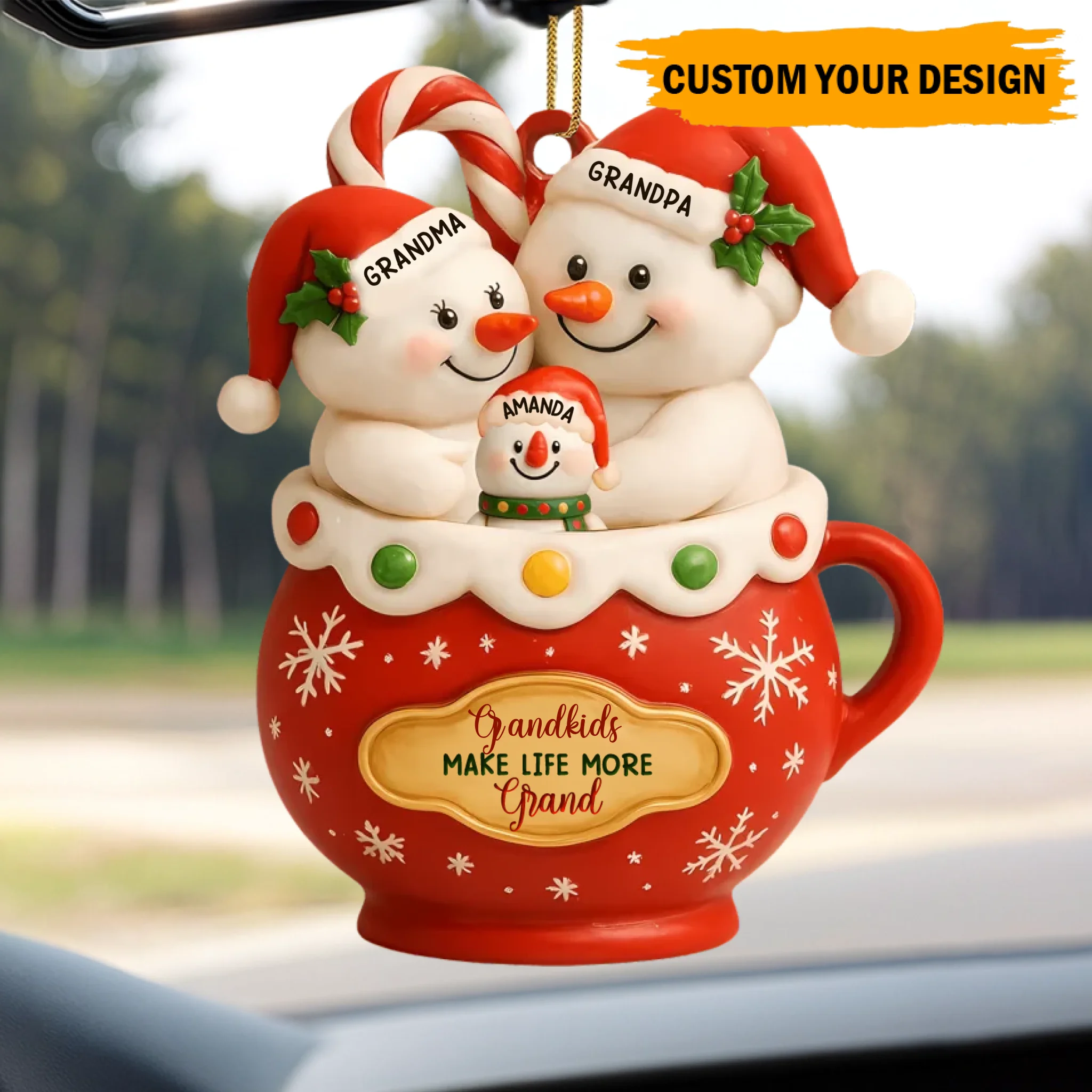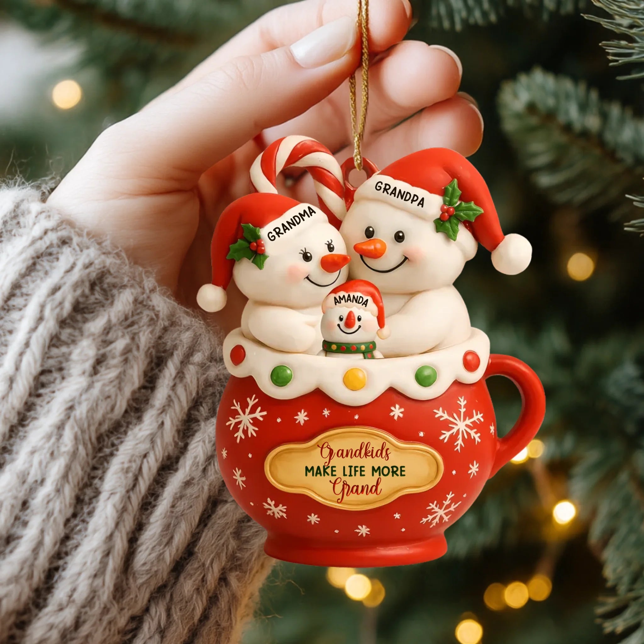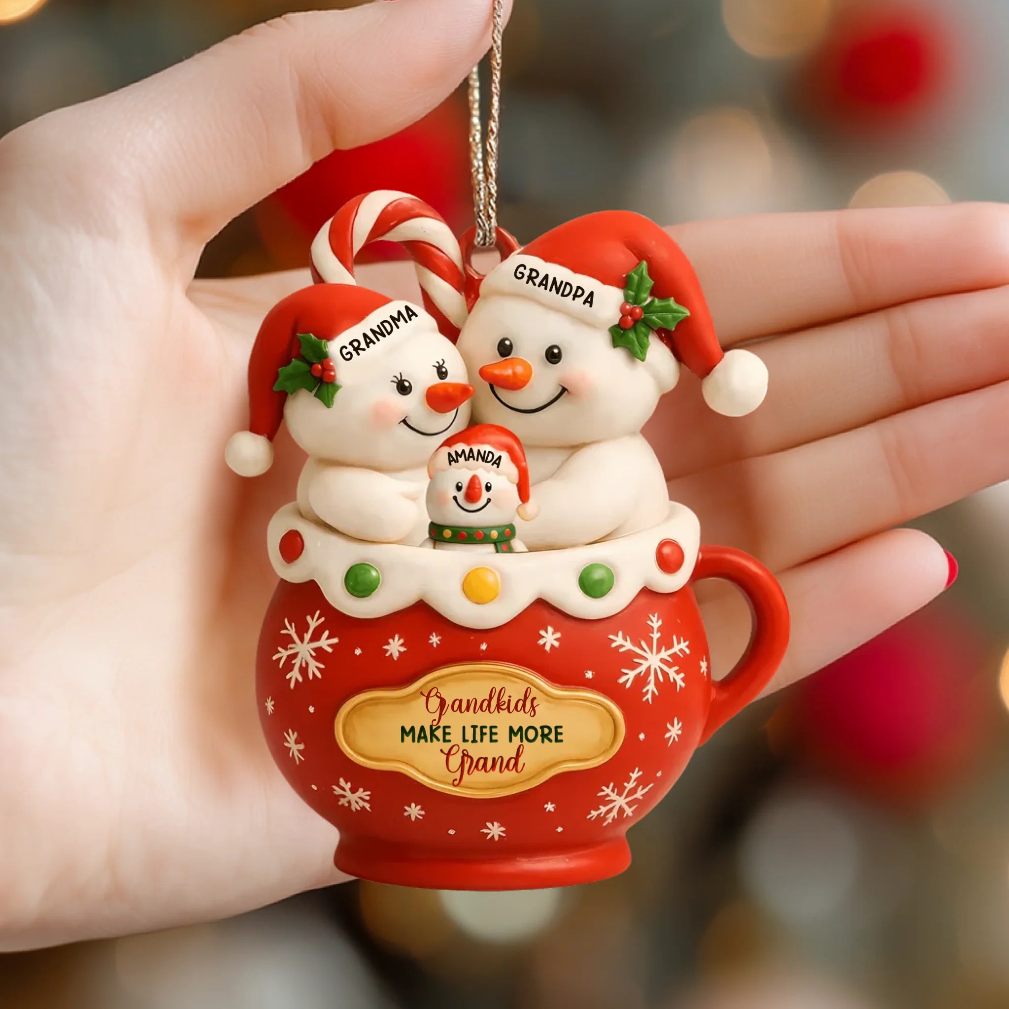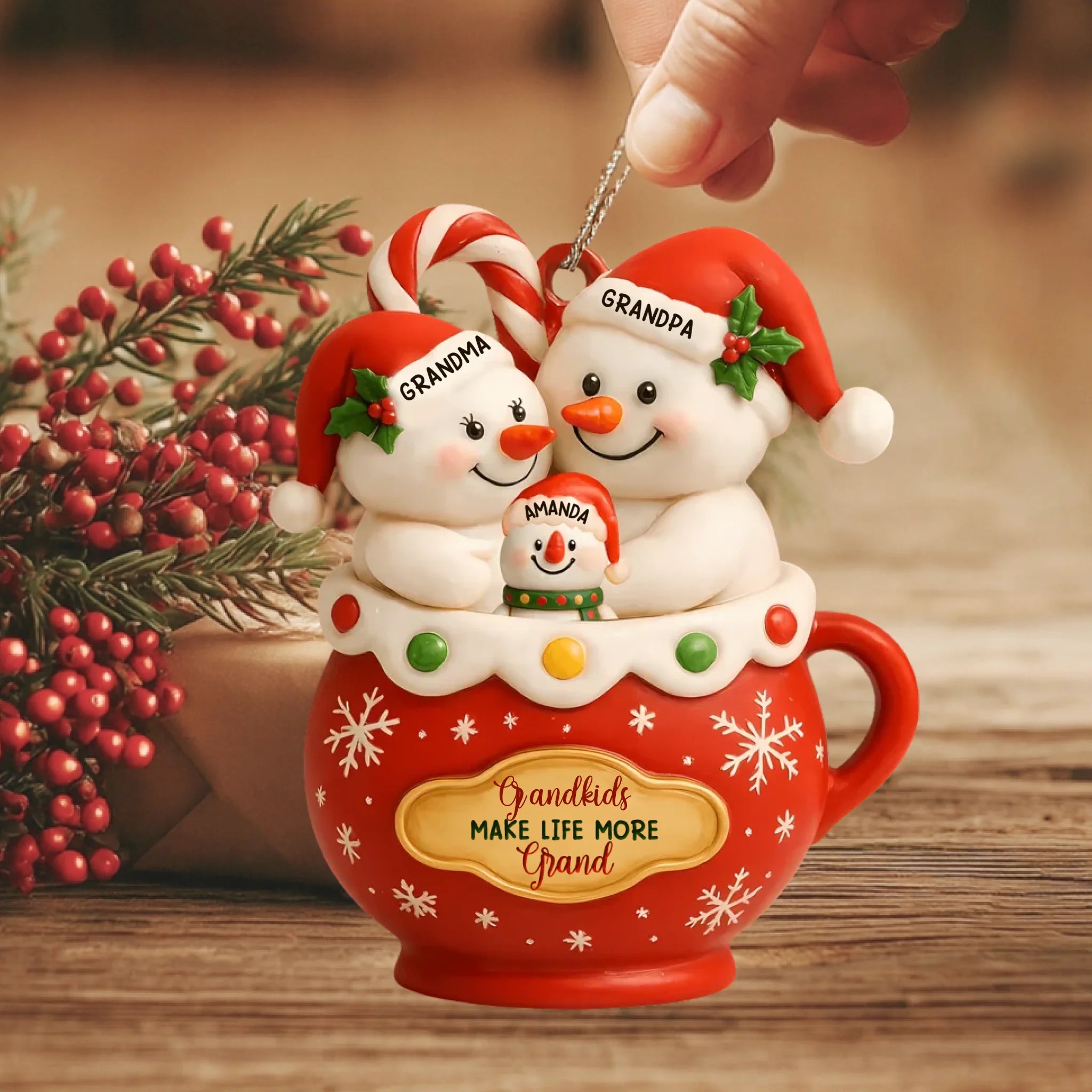 Featuring adorable snow grandparents and grandkids sitting together in a festive red mug, this ornament perfectly captures the joy and love that make family moments unforgettable.