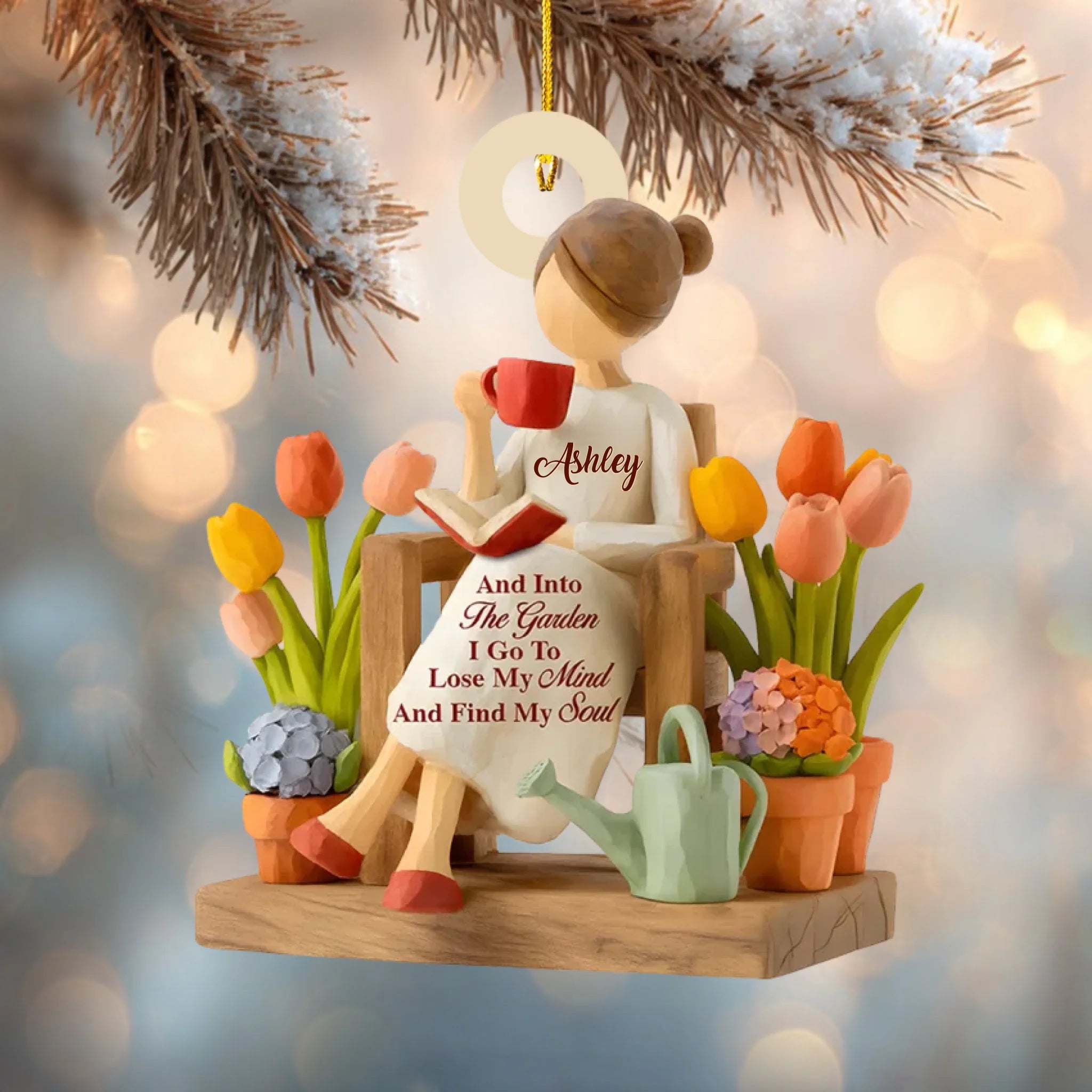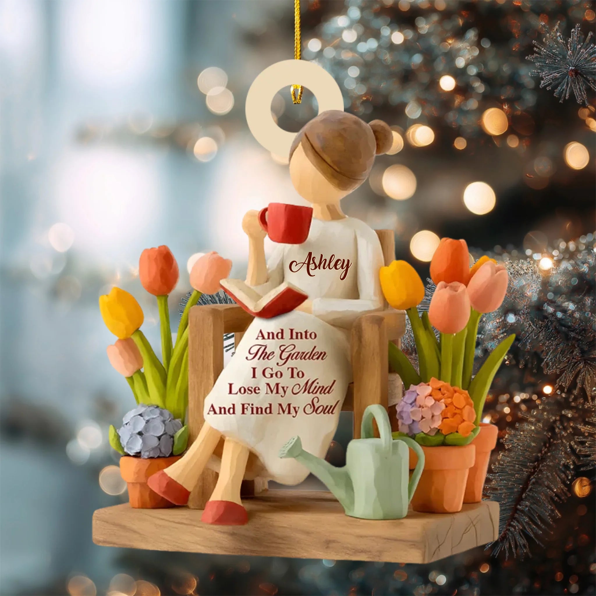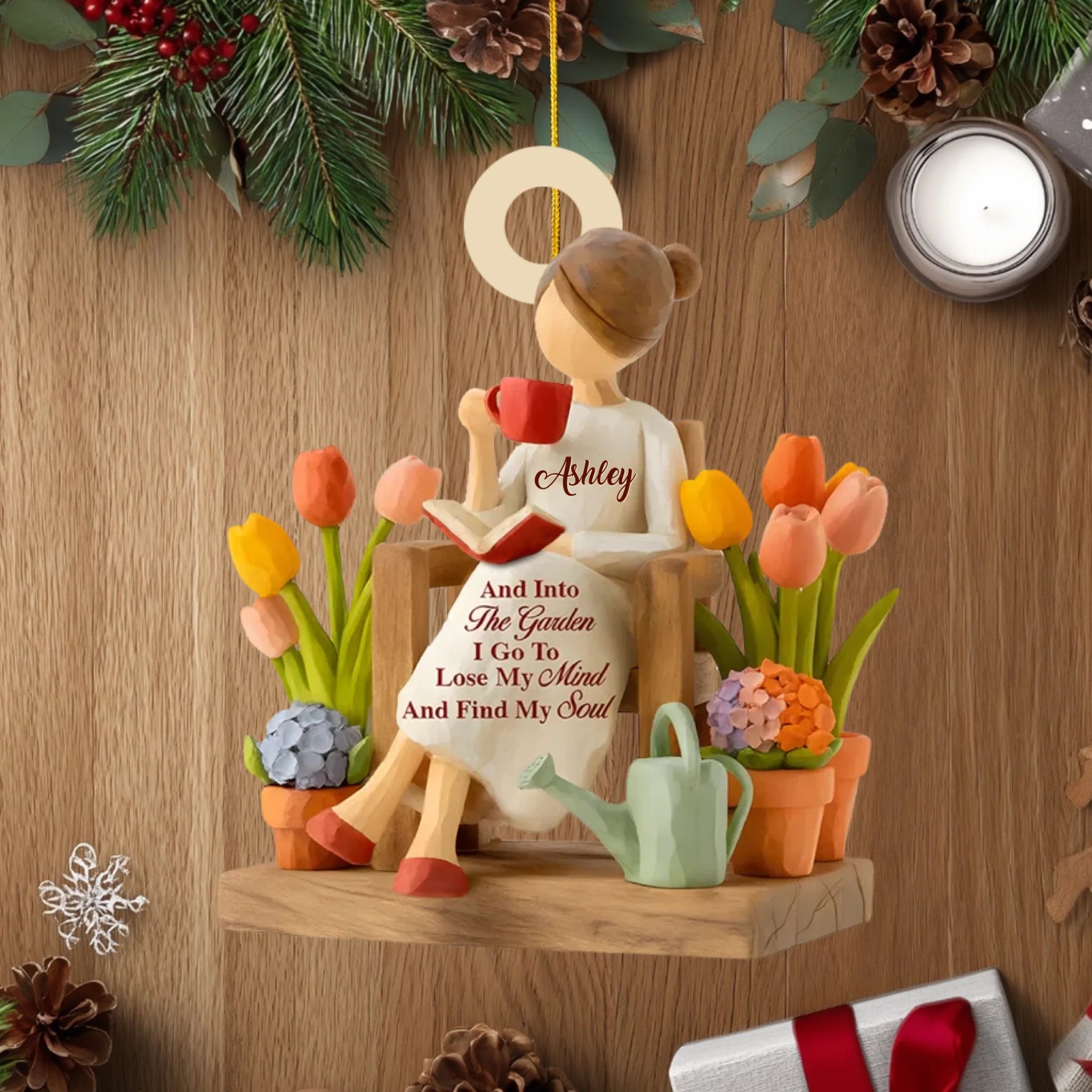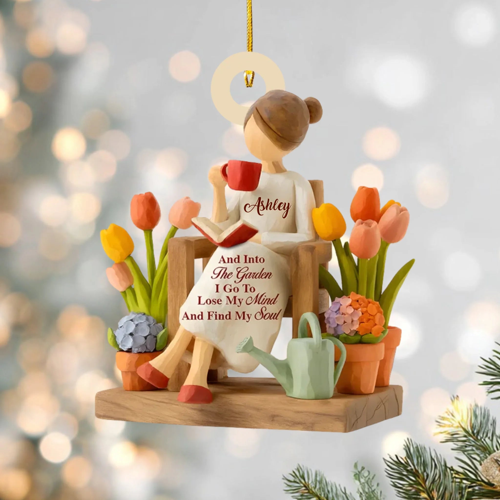 Personalized Wooden Ornament – Girl in Garden with Flowers & Book | Custom Name Gift for Garden Lovers