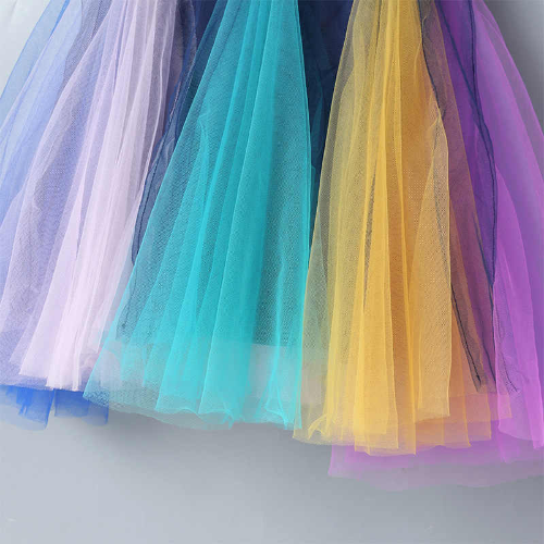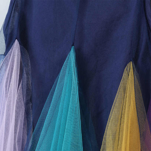 - Draped colorful mesh and patchwork knee-length dress.
