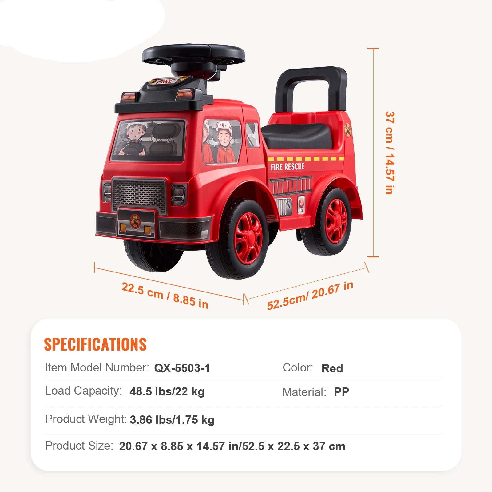 Crafted from high-quality, impact-resistant PP material and supported by a stable four-wheel structure, this ride-on car holds up to 48.5 lbs (22 kg). It’s built to handle everyday adventures while ensuring your child’s safety and comfort.