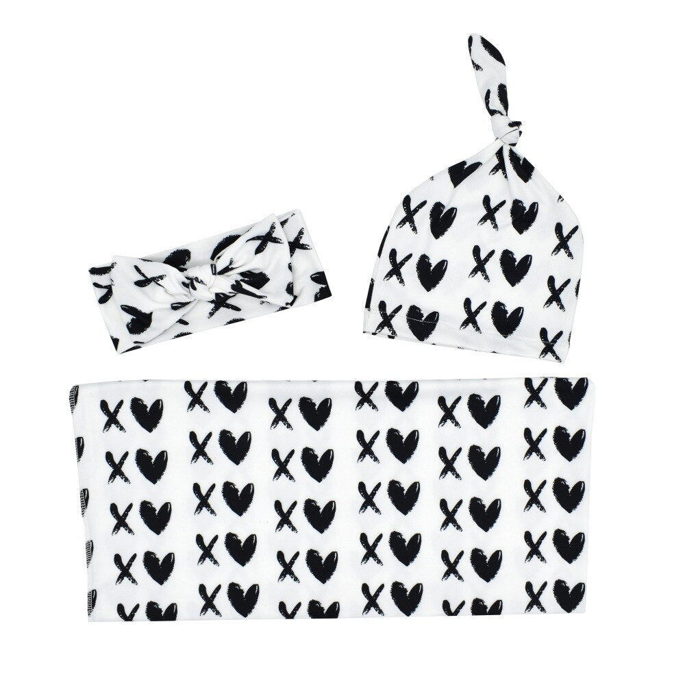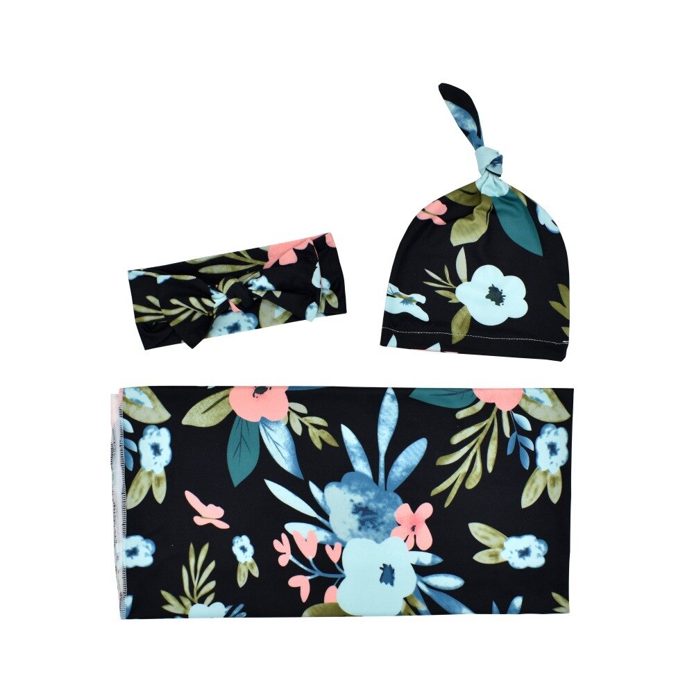 Set of Blanket Infant Swaddle, Wrap Headband, Hat Floral Print