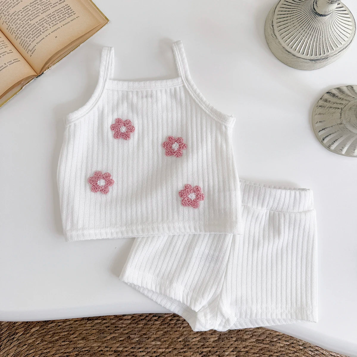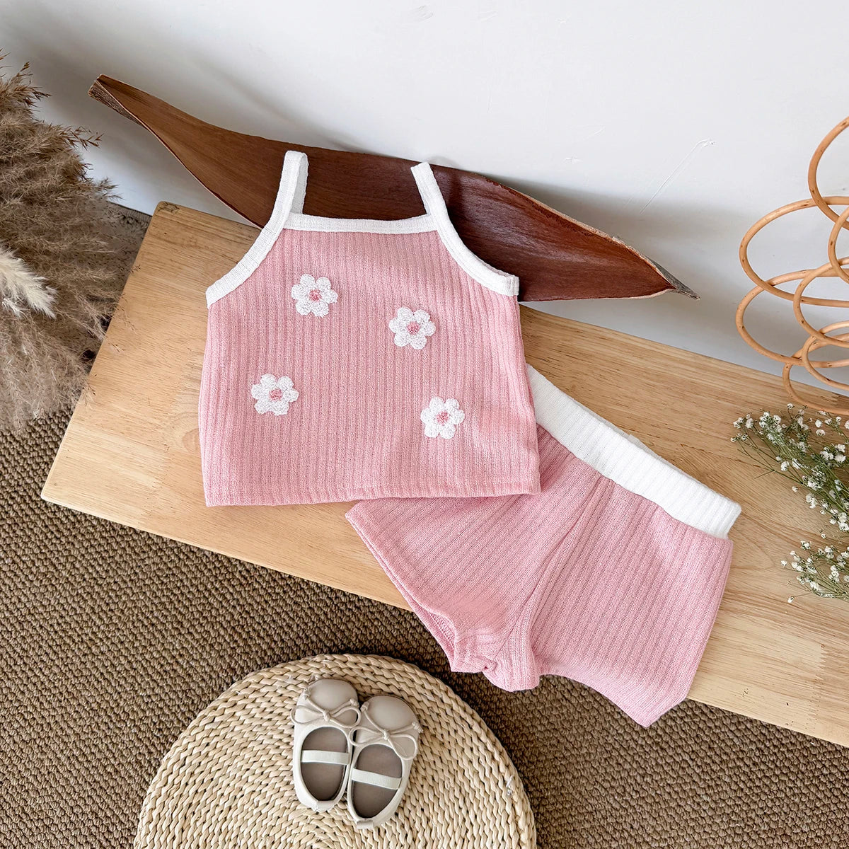 Let your baby girl bloom in style with this adorable 2-piece summer set. Featuring a lightweight ribbed camisole top with lovely embroidered flower patches and matching elastic-waist shorts, this outfit blends comfort with cuteness – perfect for everyday wear or outings in warm weather.
