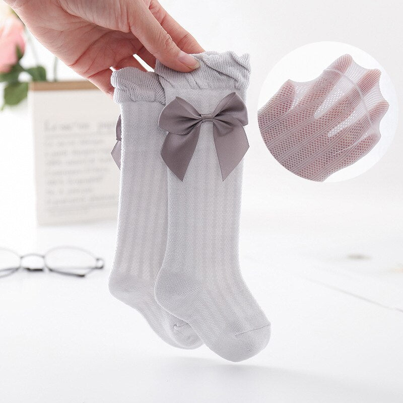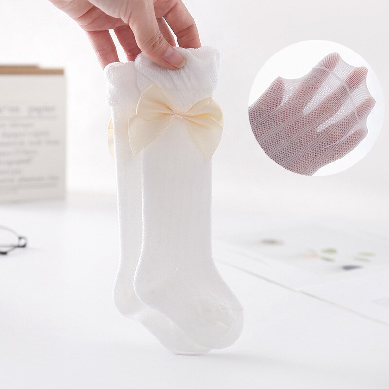 Knee-high mesh socks for children with an extremely fashionable bow design. Your baby will look very cute when paired with a skirt or shorts.