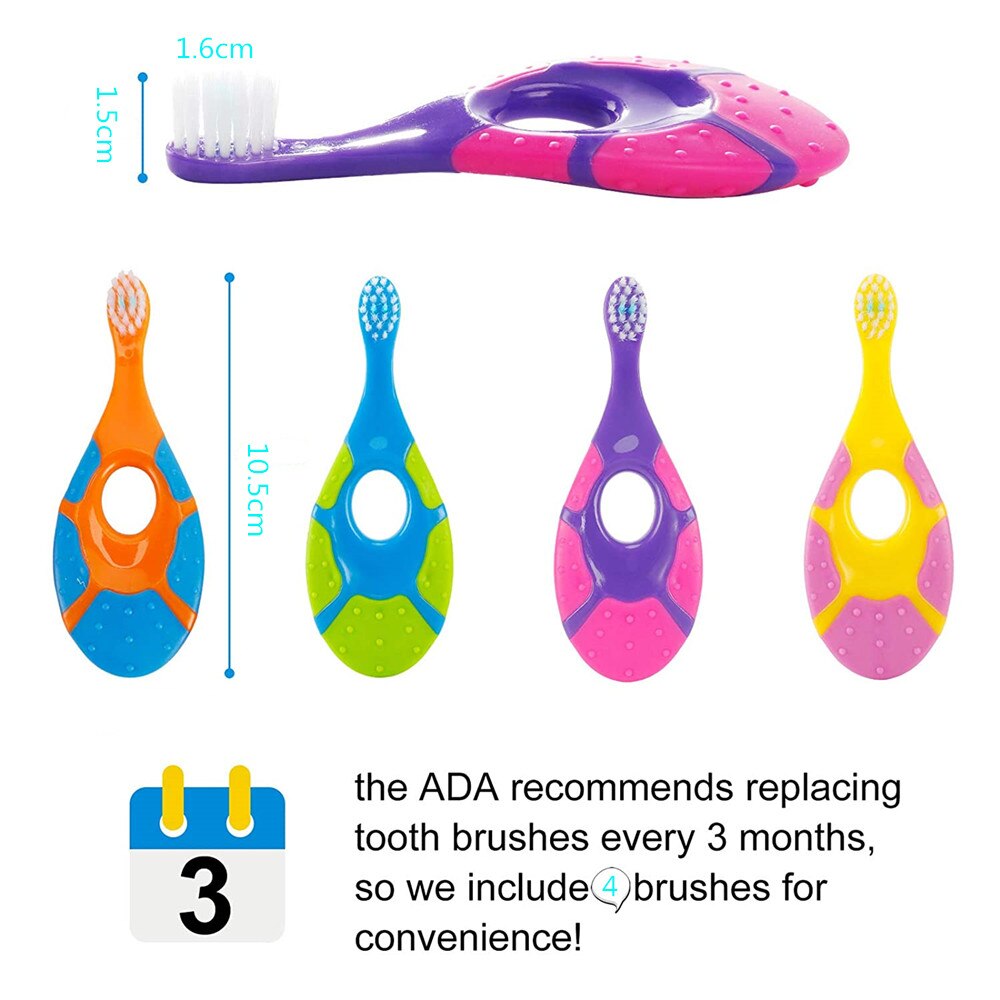 - With a short neck and practical grip ring which prevents swallowing, specially designed soft bristles which help clean your toddler’s first teeth and indicate the proper amount of toothpaste, these infant training toothbrushes are definitely a smart investment!
