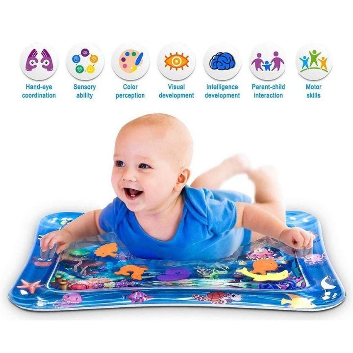 Our Tummy Time Mat has colorful marine animal toys that will appear to be moving due to the water effect. Your baby will be attracted by the colors and movements and have a great time playing on the water mat.