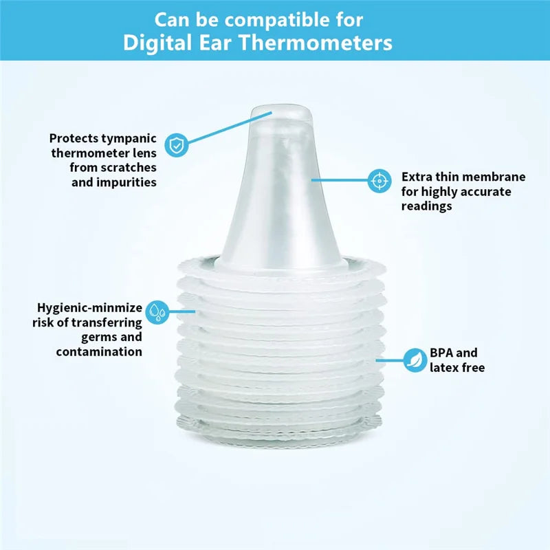 These universal disposable ear thermometer probe covers are an essential accessory for accurate and sanitary temperature monitoring. Using a clean, hygienic cover for each use ensures hygiene and accuracy when taking the temperature, providing peace of mind, especially when monitoring fever in infants and children.