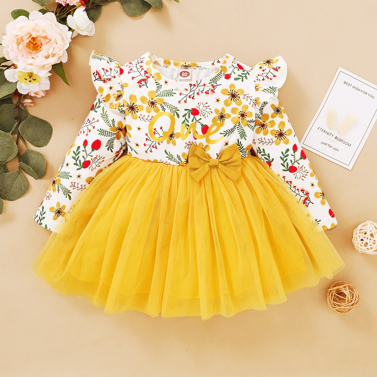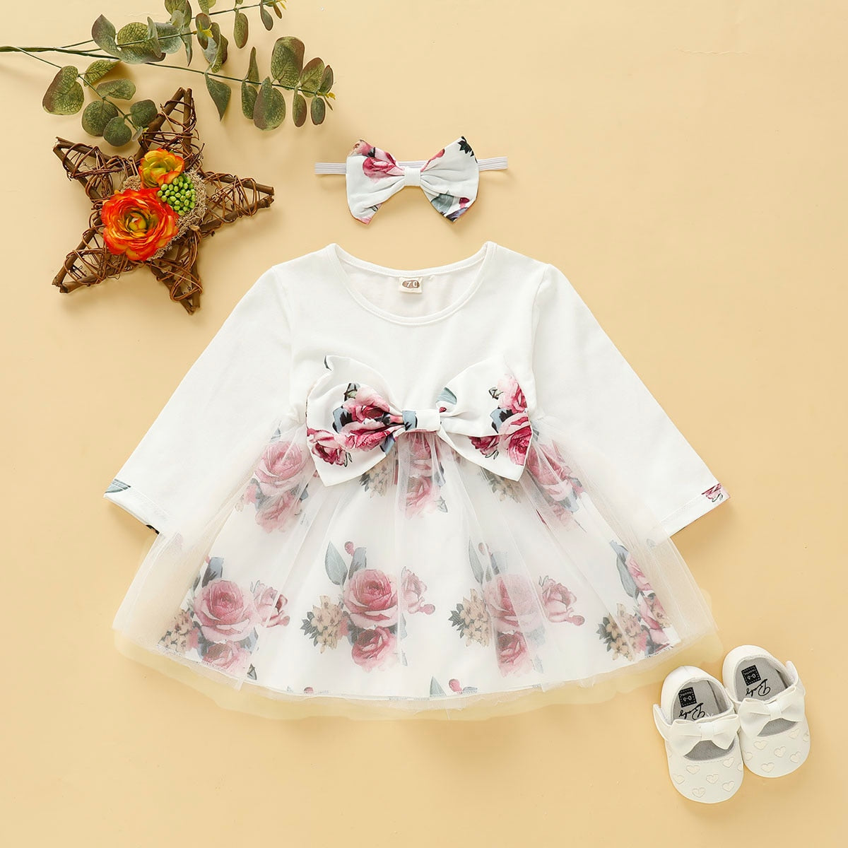 Vintage Rose and Bow Design Long Sleeves Baby Girl Dress