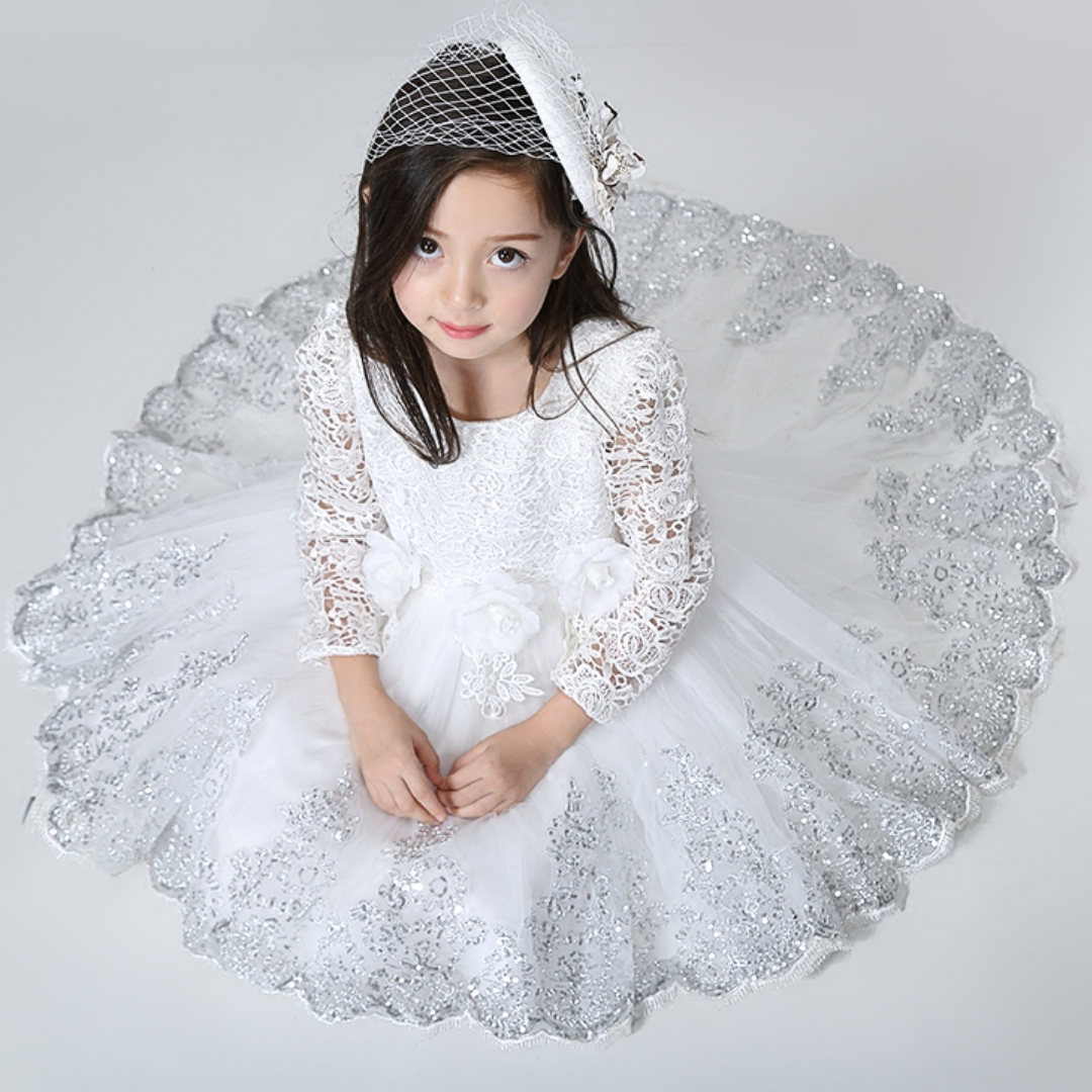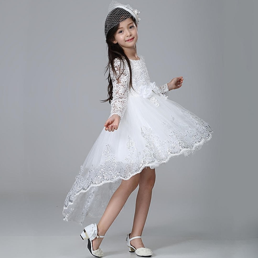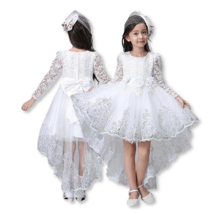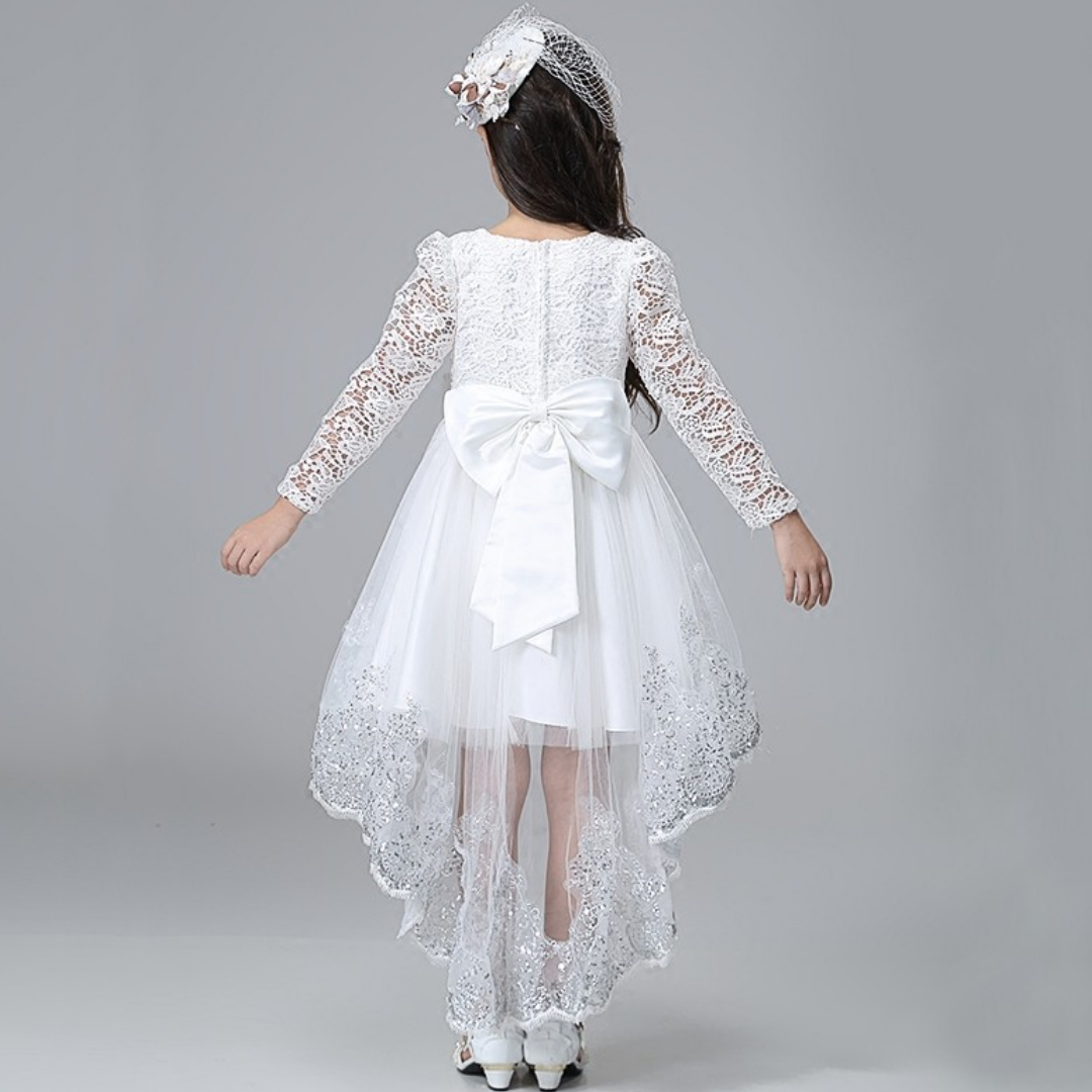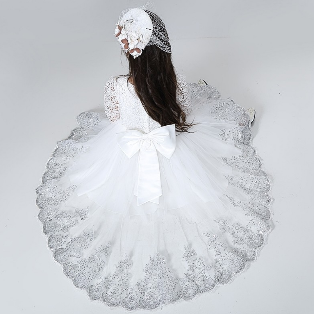 This White Full Lace Design Long Back Trail Princess Party Dress is the perfect choice for your little princess. She will feel very comfortable in this charming and elegant party dress. The design of a full lace bodice makes your girl look so beautiful, stunning, and graceful!