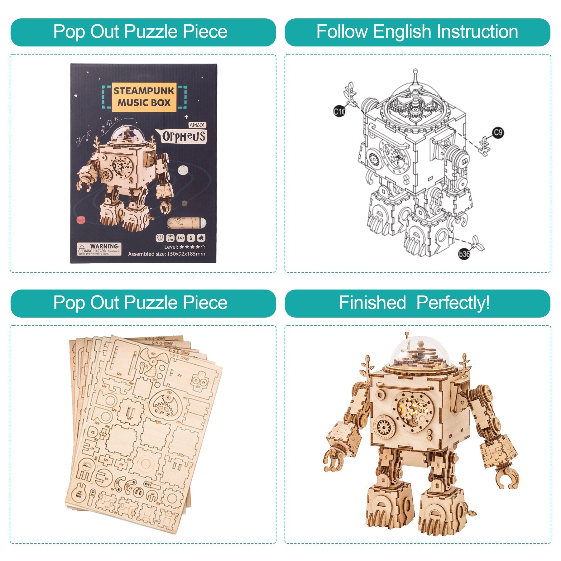 - Use laser cutting technology so that each piece could be assembled together perfectly. This is a magical wooden music box world! Turn the handle, it will sing a Song. Rotate the arm, it can be put in different postures.